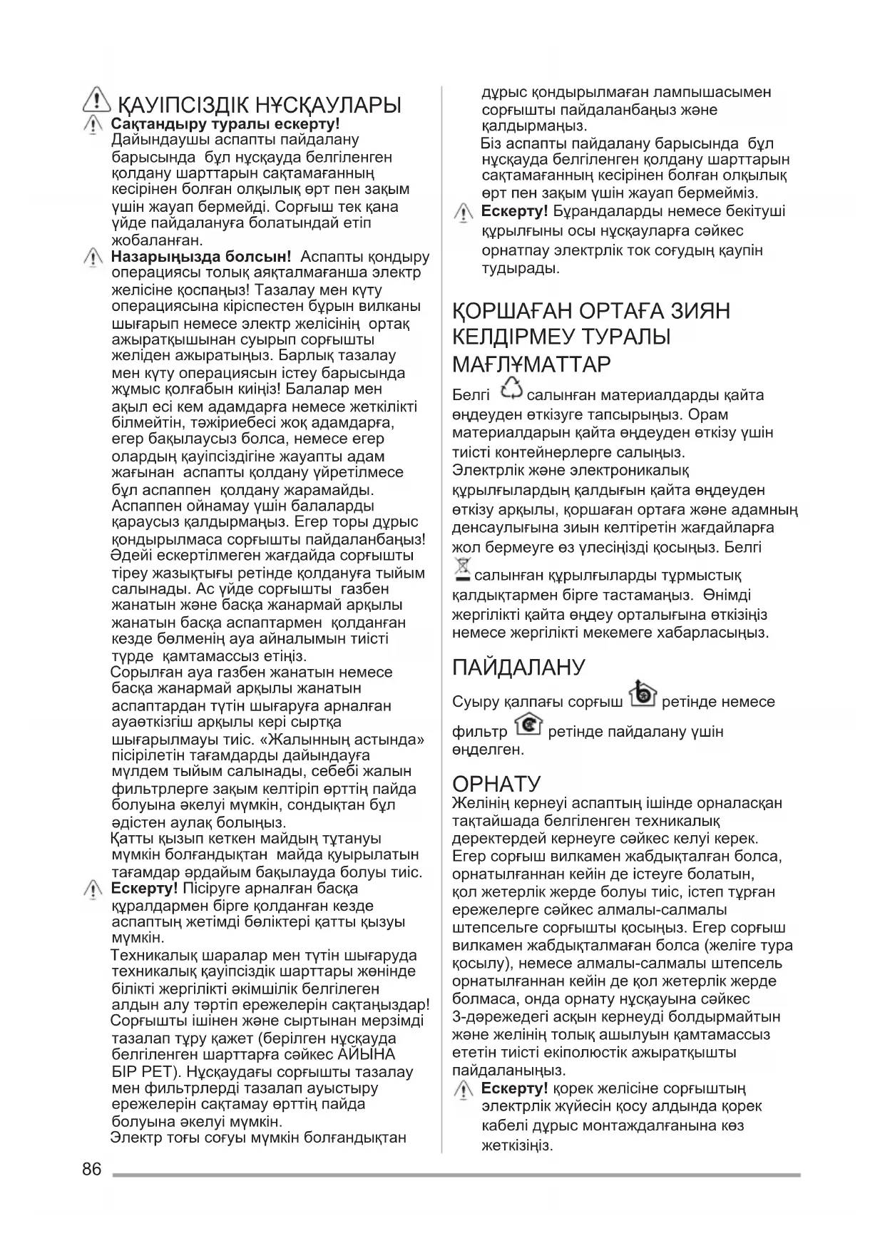Техникалық шаралар мен түтін шығаруда техникалық қауіпсіздік шарттары жөнінде білікті жергілікті əкімшілік белгілеген алдын алу тəртіп ережелерін сақтаңыздар! Сорғышты ішінен жəне сыртынан мерзімді тазалап тұру қажет (берілген нұсқауда белгіленген шарттарға сəйкес АЙЫНА БІР РЕТ). Нұсқаудағы сорғышты тазалау мен фильтрлерді тазалап ауыстыру ережелерін сақтамау өрттің пайда болуына əкелуі мүмкін. Электр тоғы соғуы мүмкін болғандықтан дұрыс қондырылмаған лампышасымен сорғышты пайдаланбаңыз жəне қалдырмаңыз. Біз аспапты пайдалану барысында бұл нұсқауда белгіленген қолдану шарттарын сақтамағанның кесірінен болған олқылық өрт пен зақым үшін жауап бермейміз. Ескерту! Бұрандаларды немесе бекітуші құрылғыны осы нұсқауларға сəйкес орнатпау электрлік ток соғудың қаупін
