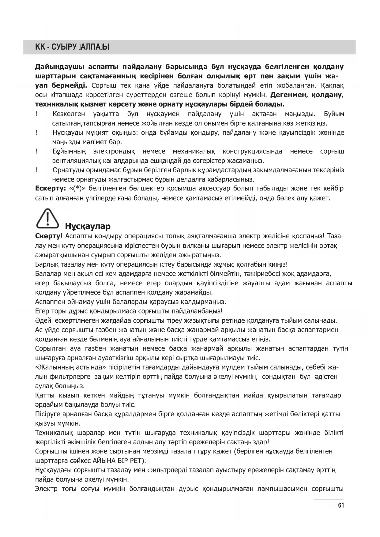 Скерту! Аспапты қондыру операциясы толық аяқталмағанша электр желісіне қоспаңыз! Таза- лау мен күту операциясына кіріспестен бұрын вилканы шығарып немесе электр желісінің ортақ ажыратқышынан суырып сорғышты желіден ажыратыңыз. Барлық тазалау мен күту операциясын істеу барысында жұмыс қолғабын киіңіз! Балалар мен ақыл есі кем адамдарға немесе жеткілікті білмейтін, тəжіриебесі жоқ адамдарға, егер бақылаусыз болса, немесе егер олардың қауіпсіздігіне жауапты адам жағынан аспапты қолдану үйретілмесе бұл аспаппен қолдану жарамайды. Аспаппен ойнамау үшін балаларды қараусыз қалдырмаңыз. Егер торы дұрыс қондырылмаса сорғышты пайдаланбаңыз! Əдейі ескертілмеген жағдайда сорғышты тіреу жазықтығы ретінде қолдануға тыйым салынады. Ас үйде сорғышты газбен жанатын жəне басқа жанармай арқылы жанатын басқа аспаптармен қолданған кезде бөлменің ауа айналымын тиісті түрде қамтамассыз етіңіз. Сорылған ауа газбен жанатын немесе басқа жанармай арқылы жанатын аспаптардан түтін шығаруға арналған ауаөткізгіш арқылы кері сыртқа шығарылмауы тиіс. «Жалынның астында» пісірілетін тағамдарды дайындауға мүлдем тыйым салынады, себебі жа- лын фильтрлерге зақым келтіріп өрттің пайда болуына əкелуі мүмкін, сондықтан бұл əдістен аулақ болыңыз. Қатты қызып кеткен майдың тұтануы мүмкін болғандықтан майда қуырылатын тағамдар əрдайым бақылауда болуы тиіс. Пісіруге арналған басқа құралдармен бірге қолданған кезде аспаптың жетімді бөліктері қатты қызуы мүмкін. Техникалық шаралар мен түтін шығаруда техникалық қауіпсіздік шарттары жөнінде білікті жергілікті əкімшілік белгілеген алдын алу тəртіп ережелерін сақтаңыздар! Сорғышты ішінен жəне сыртынан мерзімді тазалап тұру қажет (берілген нұсқауда белгіленген шарттарға сəйкес АЙЫНА БІР РЕТ). Нұсқаудағы сорғышты тазалау мен фильтрлерді тазалап ауыстыру ережелерін сақтамау өрттің пайда болуына əкелуі мүмкін. Электр тоғы соғуы мүмкін болғандықтан дұрыс қондырылмаған лампышасымен сорғышты62 пайдаланбаңыз жəне қалдырмаңыз. Біз аспапты пайдалану барысында бұл нұсқауда белгіленген қолдану шарттарын сақтамағанның кесірінен болған олқылық өрт пен зақым үшін жауап бермейміз. Электрлік жəне электрондық аспаптарды қайта пайдаға асыру жөніндегі 2002/96/ЕС Европалық директивке (WEEE) сəйкес берілген өнім таңбаланды. Берілген өнімді дұрыс қайта пайдаға асыруды қамтамассыз етумен, Сіз қоршаған ортаға жəне адам денсаулығына кері əсерін тигізу ді болдырмауға көмектесесіз. А с п а п т а ғ ы н е м е с е ж о л д а м а қ ұ ж а т т а ғ ы таңбасы берілген аспапты қайта пайдаға асы- руда əдеттегі тұрмыстық қалдық ретінде игеруге болмайтынын көрсетеді. Оның орнына электрлік жəне электрондық аспаптарды қайта пайдаға асыруға арналған қабылдау пунктіне тапсыру керек. Бұзуға тапсыру аспапты қайта пайдаға асыру жөніндегі жергілікті ережелерге сəйкес шығарылуы тиіс. Бұндай өнімдерді пайдалану, қайта пайдаға асыру ережелері жөнінде толық ақпаратты жергілікті əкімшілік орындарынан, қалдықтарды қайта пайдаға асыру қызметінен не- месе берілген өнімді Сіз сатып алған дүкенен ала аласыз. Құрылғы келесілерге сай жобаланған, сыналған жəне жасап шығарылған: