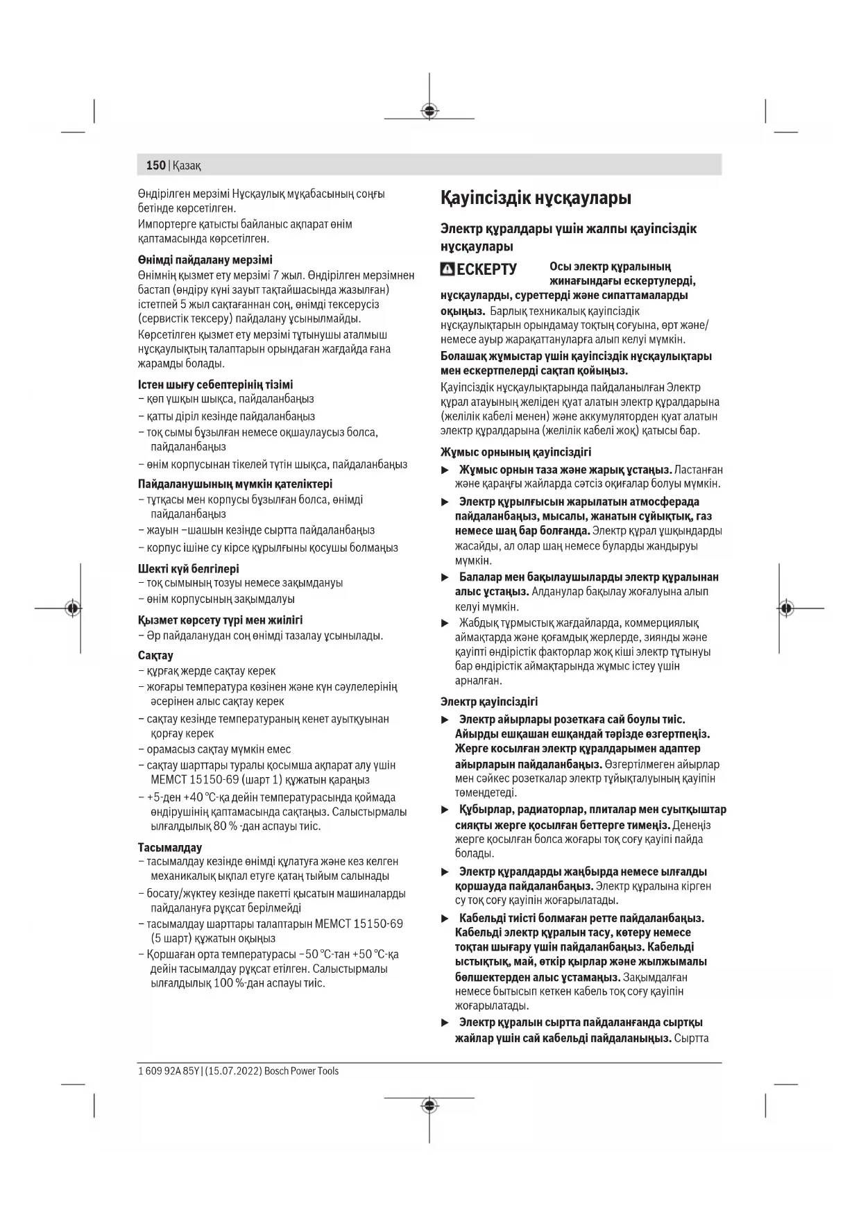 Еуразия экономикалық одағына (Кеден одағына) мүше мемлекеттер аумағында қолданылады Өндірушінің өнім үшін қарастырған пайдалану құжаттарының құрамында пайдалану жөніндегі осы нұсқаулық, сонымен бірге қосымшалар да болуы мүмкін. Сəйкестікті растау жайлы ақпарат қосымшада бар. Өнімді өндірген мемлекет туралы ақпарат өнімнің корпусында жəне қосымшада көрсетілген. Bosch Power Tools 1 609 92A 85Y | (15.07.2022)150 | Қазақ Өндірілген мерзімі Нұсқаулық мұқабасының соңғы бетінде көрсетілген. Импортерге қатысты байланыс ақпарат өнім қаптамасында көрсетілген. Өнімді пайдалану мерзімі Өнімнің қызмет ету мерзімі 7жыл. Өндірілген мерзімнен бастап (өндіру күні зауыт тақтайшасында жазылған) істетпей 5жыл сақтағаннан соң, өнімді тексерусіз (сервистік тексеру) пайдалану ұсынылмайды. Көрсетілген қызмет ету мерзімі тұтынушы аталмыш нұсқаулықтың талаптарын орындаған жағдайда ғана жарамды болады. Iстен шығу себептерінің тізімі – қөп үшқын шықса, пайдаланбаңыз – қатты діріл кезінде пайдаланбаңыз – тоқ сымы бұзылған немесе оқшаулаусыз болса, пайдаланбаңыз – өнім корпусынан тікелей түтін шықса, пайдаланбаңыз Пайдаланушының мүмкін қателіктері – тұтқасы мен корпусы бұзылған болса, өнімді пайдаланбаңыз – жауын –шашын кезінде сыртта пайдаланбаңыз – корпус ішіне су кірсе құрылғыны қосушы болмаңыз Шекті күй белгілері – тоқ сымының тозуы немесе зақымдануы – өнім корпусының зақымдалуы Қызмет көрсету түрі мен жиілігі – Әр пайдаланудан соң өнімді тазалау ұсынылады.