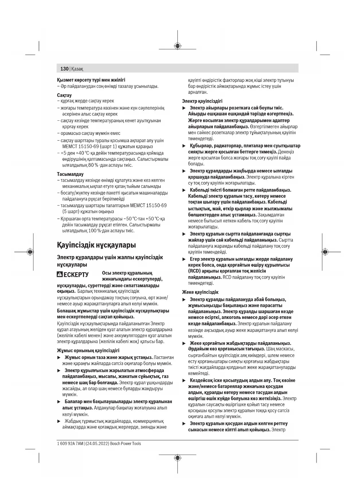 u Кездейсоқ іске қосылудың алдын алу. Тоқ көзіне және/немесе батареялар жинағына қосудан алдын, құралды көтеру немесе тасудан алдын өшіргіш өшік күйде болуына көз жеткізіңіз. Электр құралын саусақты өшіргішке қойып тасу немесе қосқышы қосулы электр құралын тоққа қосу сәтсіз оқиғаға алып келуі мүмкін. u Электр құралын қосудан алдын келген реттеу сынасын немесе кілтті алып қойыңыз. Электр 1 609 92A 7AM | (24.05.2022) Bosch Power ToolsҚазақ | 131 құралының айналатын бөлігінде қалған кілт немесе сына жеке жарақаттануға алып келуі мүмкін. u Көп күш істетпеңіз. Әрдайым тиісті таяныш пен тең салмақытылқты сақтаңыз. Бұл күтілмеген жағдайларда электр құралдың бақылануын сақтайды. u Тиісті киім киіңіз. Бос киім мен әшекейлерді киймеңіз. Шашыңыз бен киімдерді жылжымалы бөлшектерден алыс ұстаңыз. Бос киімдер, әшекейлер немесе ұзын шаш жылжымалы бөлшектер арқылы тартылуы мүмкін. u Егер шаң шығарып жинау жабдықтарына қосу құрылғылары берліген болса, онда олар қосулы болуына және тиісті ретте қолдануына көз жеткізіңіз. Шаң жинауды пайдалану шаңға байланысты зияндарды кемейтеді. u Аспаптарды жиі пайдаланып жақсы білгеннен соң масайрап кетпей қауіпсіздік принциптерін елемей отырмаңыз. Абайсыз әрекет секунд ішінде ауыр жарақаттануға алып келуі мүмкін. u НАЗАР АУДАРЫҢЫЗ! Энергиямен жабдықтаудың толықтай не жекелей тоқтатылуы немесе энергиямен жабдықтауды басқару тізбегінің ақаулануы салдарынан электр құралының жұмысында кідіріс пайда болған жағдайда, бұғатталмағандығына көз жеткізіп (болған жағдайда) барып, ажыратқышты Выкл. (Өшіру) қалпына келтіріңіз. Желілік ашаны розеткадан шығарыңыз немесе алып – салмалы аккумуляторды ажыратыңыз. Осы әрекет арқылы бақыланбайтын қайта іске қосылудың алдын аласыз. u Аталмыш пайдалану жөніндегі нұсқаулыққа сәйкес білікті қызметкерлер құрамына электр құралын реттеу, монтаждау, қолданысқа енгізу және оған қызмет көрсету әрекеттерімен таныс тұлғалар жатады. u Электр құралымен жұмыс істеуге 18 жасқа толған, техникалық сипаттаманы, пайдалану жөніндегі нұсқаулықты және қауіпсіздік ережелерін оқып шыққан тұлғаларға рұқсат етіледі. u Дене, сезім немесе ақыл-ой қабілеттері шектеулі немесе тәжірибесі мен білімі жеткіліксіз адамдар олардың қауіпсіздігі үшін жауапты тұлғаның бақылауында болмаса немесе электр құралын пайдалану бойынша нұсқау алмаған болса, бұйымды пайдаланбауы тиіс. Электр құралдарын пайдалану және күту u Құралды аса көп жүктемеңіз. Жұмысыңыз үшін жарамды электр құралын пайдаланыңыз. Жарамды электр құралымен керекті жұмыс аймағында дұрыс әрі сенімді жұмыс істейсіз. u Ажыратқышы дұрыс емес электр құралын пайдаланбаңыз. Қосуға немесе өшіруге болмайтын электр құралы қауіпті болып, оны жөндеу қажет