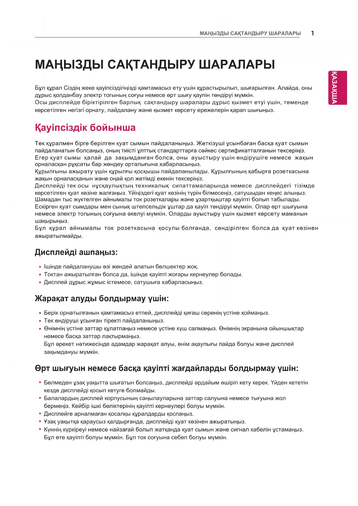 Дисплей экранының алдыңғы жағын тазалау үшін, өнімді қуат көзінен ажыратыңыз. Сәл ылғалданған (сулы емес) шүберекті пайдаланыңыз. Аэрозольді тікелей экранның бетіне сеппеңіз, электр тогы соғуы мүмкін. Өнімді тазалау кезінде, қуат сымын ажыратып, сырылуын болдырмау үшін жұмсақ шүберекпен сүртіңіз. Сулы шүберекпен тазаламаңыз не өнімнің бетіне су немесе басқа сұйықтықтар сеппеңіз. Электр тогы соғуы мүмкін. (Бензин, бояу еріткіштері немесе спирт сияқты химиялық заттар қолданбаңыз) Жұмсақ шүберекке 2-4 рет су сеуіп, бір жаққа бағыттай отырып, алдыңғы жақтауын сүрту үшін пайдаланыңыз. Тым ылғал болса, дақтар пайда болуы мүмкін.Қуат сымын айнымалы ток адаптеріне толығымен кіргізіңіз. Дұрыс жалғанбаса, нашар байланыстан өрт шығуы немесе ток шығуы мүмкін.LG Electronics, Inc. қамтамасыз еткен немесе мақұлдаған қуат сымдарын және айнымалы ток адаптерлерін пайдаланыңыз. Мақұлданбаған өнімдерді пайдаланудан өрт шығуы немесе ток соғуы мүмкін.Қуат сымын ажыратқанда әрдайым ашасынан ұстап тартыңыз. Қуат сымын күштеп майыстырмаңыз. Қуат желісі зақымдалып, ток соғуына немесе өрт шығуына себеп болуы мүмкін.Қуат сымының немесе айнымалы ток адаптерінің үстінен баспаңыз не болмаса үстіне ауыр заттар (электронды құрылғылар, киімдер, т.б.) қоймаңыз. Қуат сымын немесе айнымалы ток адаптерін өткір заттармен зақымдап алмаңыз. Зақымдалған қуат сымдарынан өрт шығуы немесе ток соғуы мүмкін.Ешқашан қуат сымын немесе айнымалы ток адаптерін бөлектемеңіз, жөндемеңіз немесе өзгертпеңіз. Өрт шығуы немесе ток соғуы мүмкін.Қуат сымын, айнымалы ток адаптерін және қуат ашасының істікшелерін шаңнан және т.б. таза ұстаңыз. Бұл өрт шығу қаупін төндіруі мүмкін.