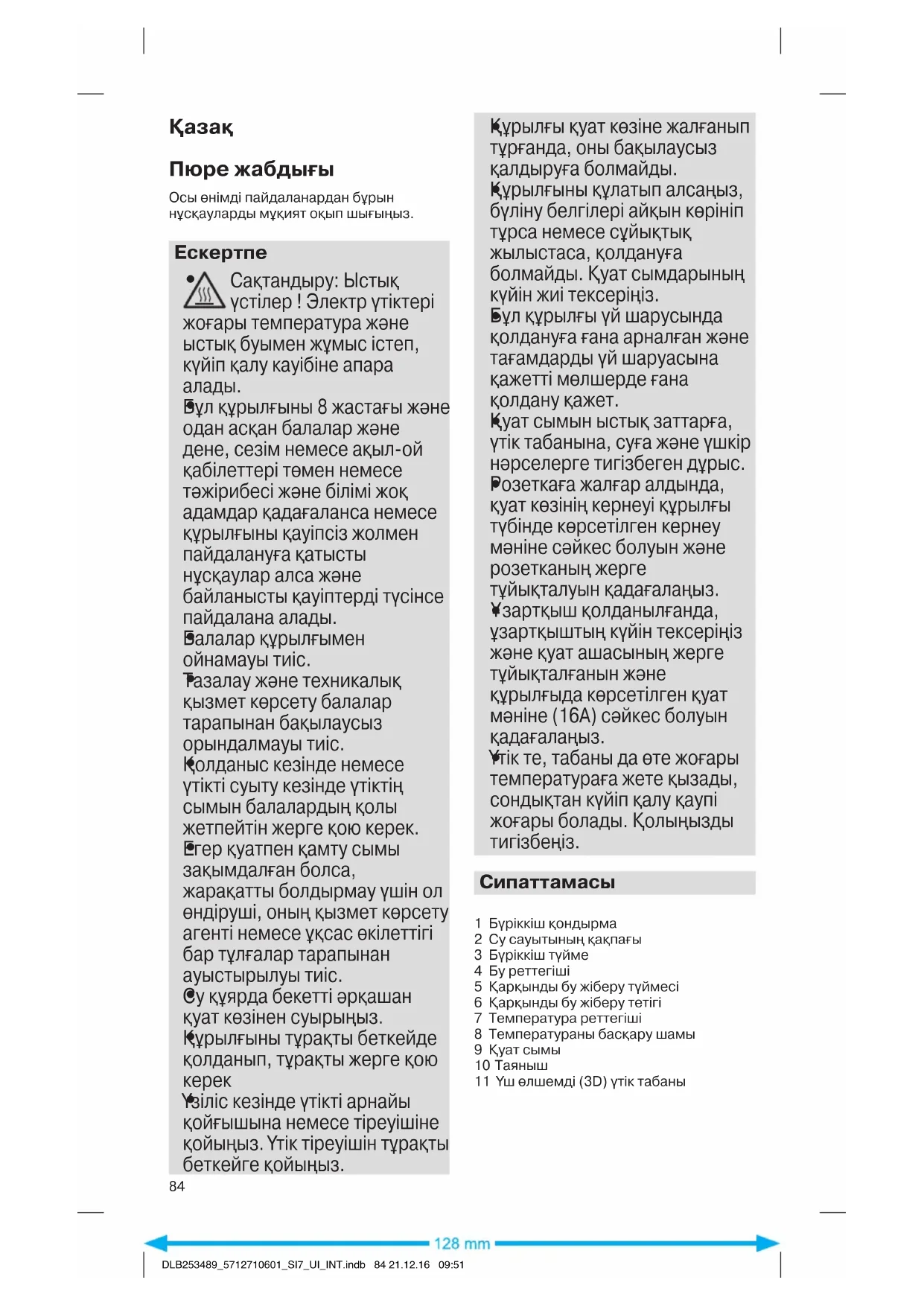 DLB253489_5712710601_SI7_UI_INT.indb 83 21.12.16 09:51Қазақ Пюре жабдығы Осы өнімді пайдаланардан бұрын нұсқауларды мұқият оқып шығыңыз.