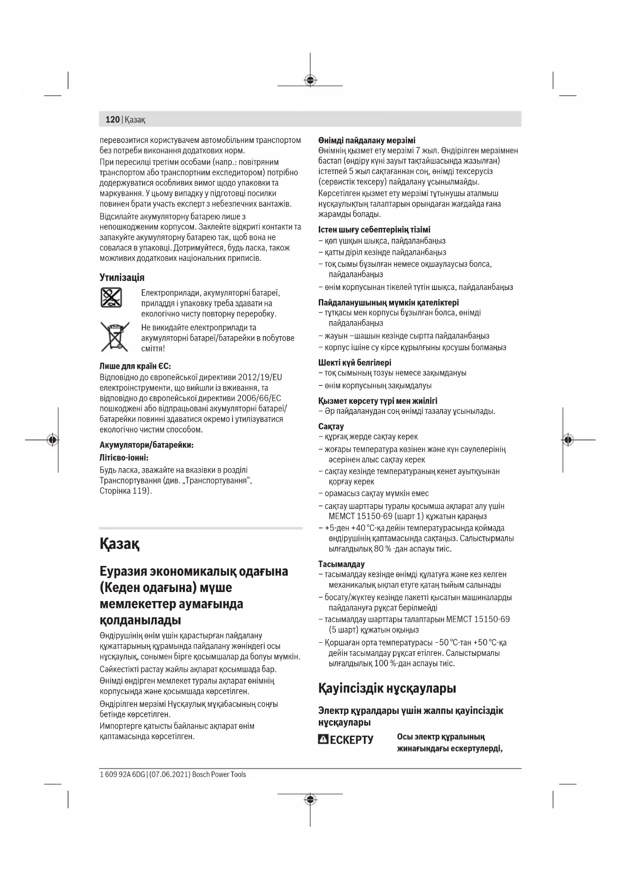 u Кездейсоқ іске қосылудың алдын алу. Тоқ көзіне және/немесе батареялар жинағына қосудан алдын, құралды көтеру немесе тасудан алдын өшіргіш өшік күйде болуына көз жеткізіңіз. Электр құралын саусақты өшіргішке қойып тасу немесе қосқышы қосулы электр құралын тоққа қосу сәтсіз оқиғаға алып келуі мүмкін. u Электр құралын қосудан алдын келген реттеу сынасын немесе кілтті алып қойыңыз. Электр құралының айналатын бөлігінде қалған кілт немесе сына жеке жарақаттануға алып келуі мүмкін. u Көп күш істетпеңіз. Әрдайым тиісті таяныш пен тең салмақытылқты сақтаңыз. Бұл күтілмеген жағдайларда электр құралдың бақылануын сақтайды. u Тиісті киім киіңіз. Бос киім мен әшекейлерді киймеңіз. Шашыңыз бен киімдерді жылжымалы бөлшектерден алыс ұстаңыз. Бос киімдер, әшекейлер немесе ұзын шаш жылжымалы бөлшектер арқылы тартылуы мүмкін. u Егер шаң шығарып жинау жабдықтарына қосу құрылғылары берліген болса, онда олар қосулы болуына және тиісті ретте қолдануына көз жеткізіңіз. Шаң жинауды пайдалану шаңға байланысты зияндарды кемейтеді. u Аспаптарды жиі пайдаланып жақсы білгеннен соң масайрап кетпей қауіпсіздік принциптерін елемей отырмаңыз. Абайсыз әрекет секунд ішінде ауыр жарақаттануға алып келуі мүмкін. u НАЗАР АУДАРЫҢЫЗ! Энергиямен жабдықтаудың толықтай не жекелей тоқтатылуы немесе энергиямен жабдықтауды басқару тізбегінің ақаулануы салдарынан электр құралының жұмысында кідіріс пайда болған жағдайда, бұғатталмағандығына көз жеткізіп (болған жағдайда) барып, ажыратқышты Выкл. (Өшіру) қалпына келтіріңіз. Желілік ашаны розеткадан шығарыңыз немесе алып – салмалы аккумуляторды ажыратыңыз. Осы әрекет арқылы бақыланбайтын қайта іске қосылудың алдын аласыз. u Аталмыш пайдалану жөніндегі нұсқаулыққа сәйкес білікті қызметкерлер құрамына электр құралын реттеу, монтаждау, қолданысқа енгізу және оған қызмет көрсету әрекеттерімен таныс тұлғалар жатады. Bosch Power Tools 1 609 92A 6DG | (07.06.2021)122 | Қазақ u Электр құралымен жұмыс істеуге 18 жасқа толған, техникалық сипаттаманы, пайдалану жөніндегі нұсқаулықты және қауіпсіздік ережелерін оқып шыққан тұлғаларға рұқсат етіледі. u Дене, сезім немесе ақыл-ой қабілеттері шектеулі немесе тәжірибесі мен білімі жеткіліксіз адамдар олардың қауіпсіздігі үшін жауапты тұлғаның бақылауында болмаса немесе электр құралын пайдалану бойынша нұсқау алмаған болса, бұйымды пайдаланбауы тиіс. Электр құралдарын пайдалану және күту u Құралды аса көп жүктемеңіз. Жұмысыңыз үшін жарамды электр құралын пайдаланыңыз. Жарамды электр құралымен керекті жұмыс аймағында дұрыс әрі сенімді жұмыс істейсіз. u Ажыратқышы дұрыс емес электр құралын пайдаланбаңыз. Қосуға немесе өшіруге болмайтын электр құралы қауіпті болып, оны жөндеу қажет