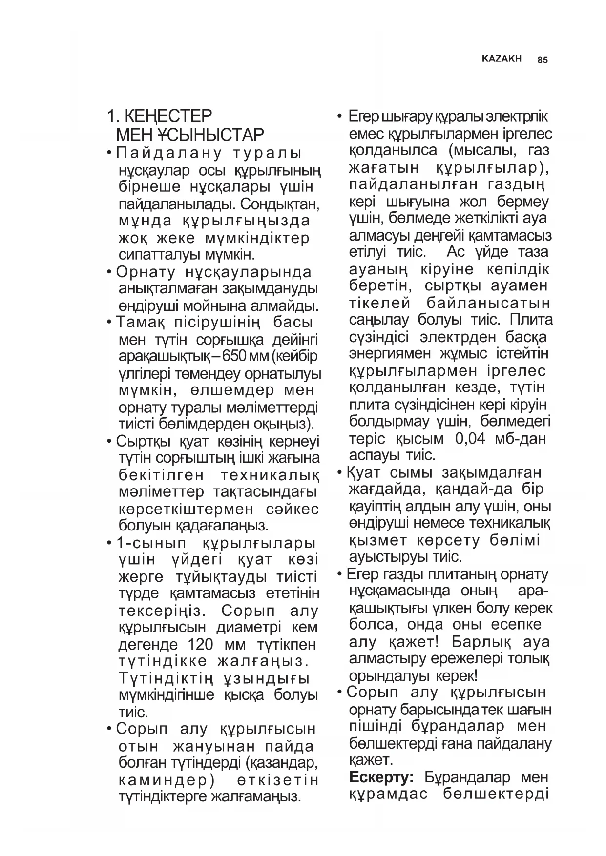 - Егер шығару құралы электрлік емес құрылғылармен іргелес қолданылса (мысалы, газ жағатын құрылғылар), пайдаланылған газдың кері шығуына жол бермеу үшін, бөлмеде жеткілікті ауа алмасуы деңгейі қамтамасыз етілуі тиіс. Ас үйде таза ауаның кіруіне кепілдік беретін, сыртқы ауамен тікелей байланысатын саңылау болуы тиіс. Плита сүзіндісі электрден басқа энергиямен жұмыс істейтін құрылғылармен іргелес қолданылған кезде, түтін плита сүзіндісінен кері кіруін болдырмау үшін, бөлмедегі теріс қысым 0,04 мб-дан аспауы тиіс.