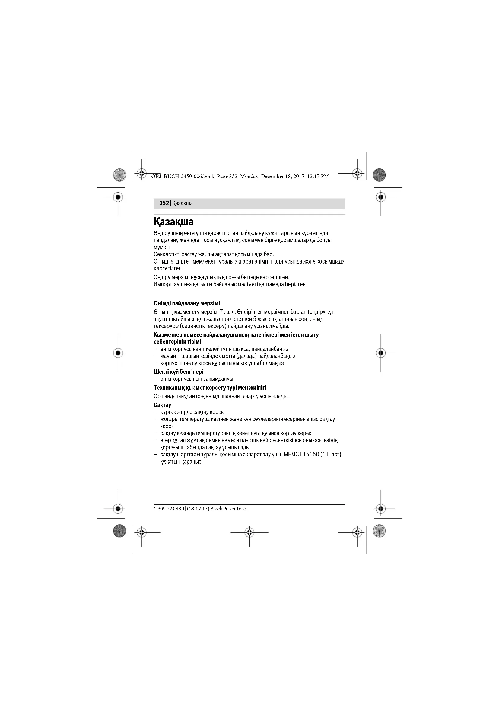 –сақтау кезінде температураның кенет ауытқуынан қорғау керек –егер құрал жұмсақ сөмке немесе пластик кейсте жеткізілсе оны осы өзінің қорғағыш қабында сақтау ұсынылады – сақтау шарттары туралы қос ымша ақпарат алу үшін МЕМСТ 15150 (1 Шарт) құжатын қараңыз OBJ_BUCH-2450-006.book Page 352 Monday, December 18, 2017 12:17 PMҚaзақша | 353 Bosch Power Tools 1 609 92A 48U | (18.12.17)
