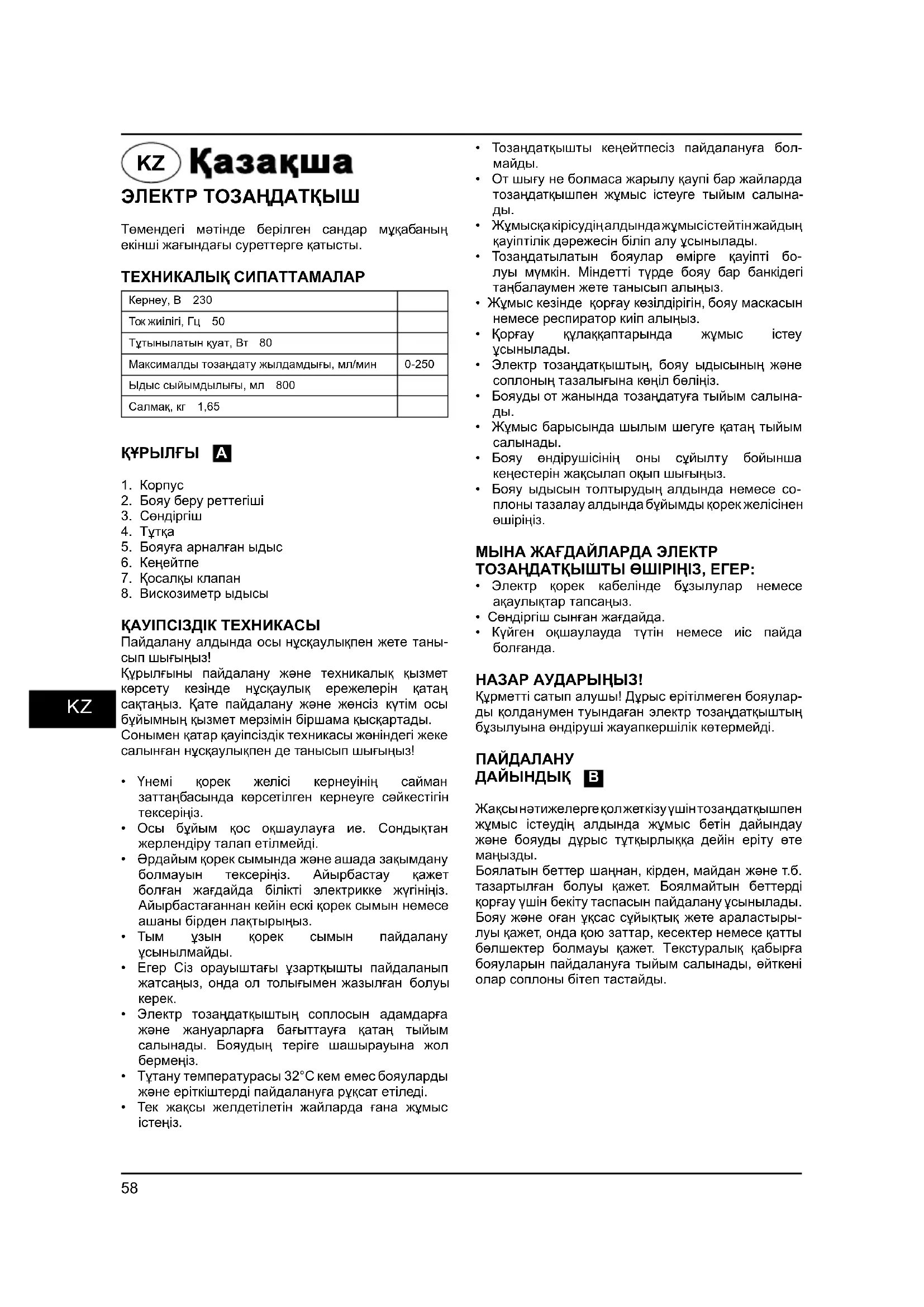 НАЗАР АУДАРЫҢЫЗ! Құрметті сатып алушы! Дұрыс ерітілмеген бояулар- ды қолданумен туындаған электр тозаңдатқыштың бұзылуына өндіруші жауапкершілік көтермейді.