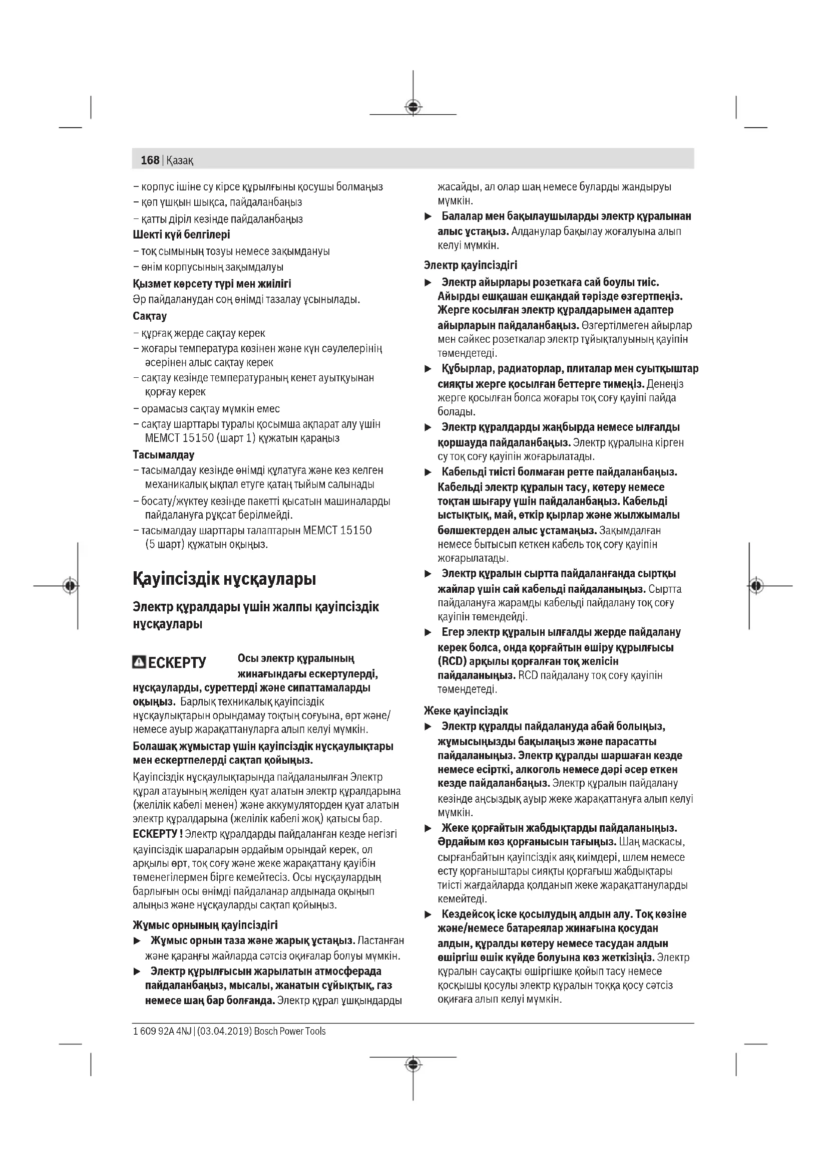 Еуразия экономикалық одағына (Кеден одағына) мүше мемлекеттер аумағында қолданылады Өндірушінің өнім үшін қарастырған пайдалану құжаттарының құрамында пайдалану жөніндегі осы нұсқаулық, сонымен бірге қосымшалар да болуы мүмкін. Сəйкестікті растау жайлы ақпарат қосымшада бар. Өнімді өндірген мемлекет туралы ақпарат өнімнің корпусында жəне қосымшада көрсетілген. Өндірілген мерзімі Нұсқаулық мұқабасының соңғы бетінде көрсетілген. Импортерге қатысты байланыс ақпарат өнім қаптамасында көрсетілген. Өнімді пайдалану мерзімі Өнімнің қызмет ету мерзімі 7 жыл. Өндірілген мерзімнен бастап (өндіру күні зауыт тақтайшасында жазылған) істетпей 5 жыл сақтағаннан соң, өнімді тексерусіз (сервистік тексеру) пайдалану ұсынылмайды. Қызметкер немесе пайдаланушының қателіктері мен істен шығу себептерінің тізімі – тұтқасы мен корпусы бұзылған болса, өнімді пайдаланбаңыз – өнім корпусынан тікелей түтін шықса, пайдаланбаңыз – тоқ сымы бұзылған немесе оқшаулаусыз болса, пайдаланбаңыз – жауын –шашын кезінде сыртта (далада) пайдаланбаңыз Bosch Power Tools 1 609 92A 4NJ | (03.04.2019)168 | Қазақ – корпус ішіне су кірсе құрылғыны қосушы болмаңыз – қөп үшқын шықса, пайдаланбаңыз – қатты діріл кезінде пайдаланбаңыз Шекті күй белгілері – тоқ сымының тозуы немесе зақымдануы – өнім корпусының зақымдалуы Қызмет көрсету түрі мен жиілігі Әр пайдаланудан соң өнімді тазалау ұсынылады.