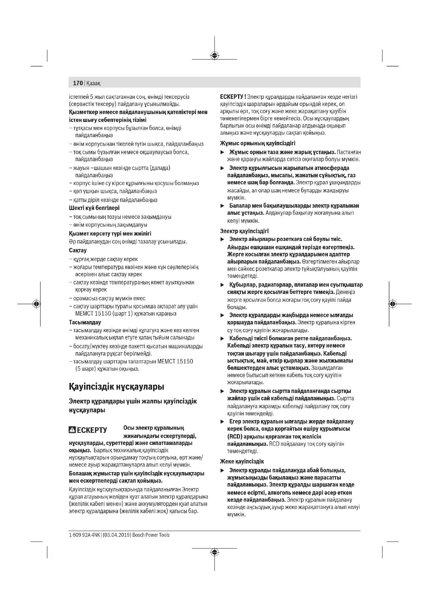 Еуразия экономикалық одағына (Кеден одағына) мүше мемлекеттер аумағында қолданылады Өндірушінің өнім үшін қарастырған пайдалану құжаттарының құрамында пайдалану жөніндегі осы нұсқаулық, сонымен бірге қосымшалар да болуы мүмкін. Сəйкестікті растау жайлы ақпарат қосымшада бар. Өнімді өндірген мемлекет туралы ақпарат өнімнің корпусында жəне қосымшада көрсетілген. Өндірілген мерзімі Нұсқаулық мұқабасының соңғы бетінде көрсетілген. Импортерге қатысты байланыс ақпарат өнім қаптамасында көрсетілген. Өнімді пайдалану мерзімі Өнімнің қызмет ету мерзімі 7 жыл. Өндірілген мерзімнен бастап (өндіру күні зауыт тақтайшасында жазылған) Bosch Power Tools 1 609 92A 4NK | (03.04.2019)170 | Қазақ істетпей 5 жыл сақтағаннан соң, өнімді тексерусіз (сервистік тексеру) пайдалану ұсынылмайды. Қызметкер немесе пайдаланушының қателіктері мен істен шығу себептерінің тізімі – тұтқасы мен корпусы бұзылған болса, өнімді пайдаланбаңыз – өнім корпусынан тікелей түтін шықса, пайдаланбаңыз – тоқ сымы бұзылған немесе оқшаулаусыз болса, пайдаланбаңыз – жауын –шашын кезінде сыртта (далада) пайдаланбаңыз – корпус ішіне су кірсе құрылғыны қосушы болмаңыз – қөп үшқын шықса, пайдаланбаңыз – қатты діріл кезінде пайдаланбаңыз Шекті күй белгілері – тоқ сымының тозуы немесе зақымдануы – өнім корпусының зақымдалуы Қызмет көрсету түрі мен жиілігі Әр пайдаланудан соң өнімді тазалау ұсынылады.
