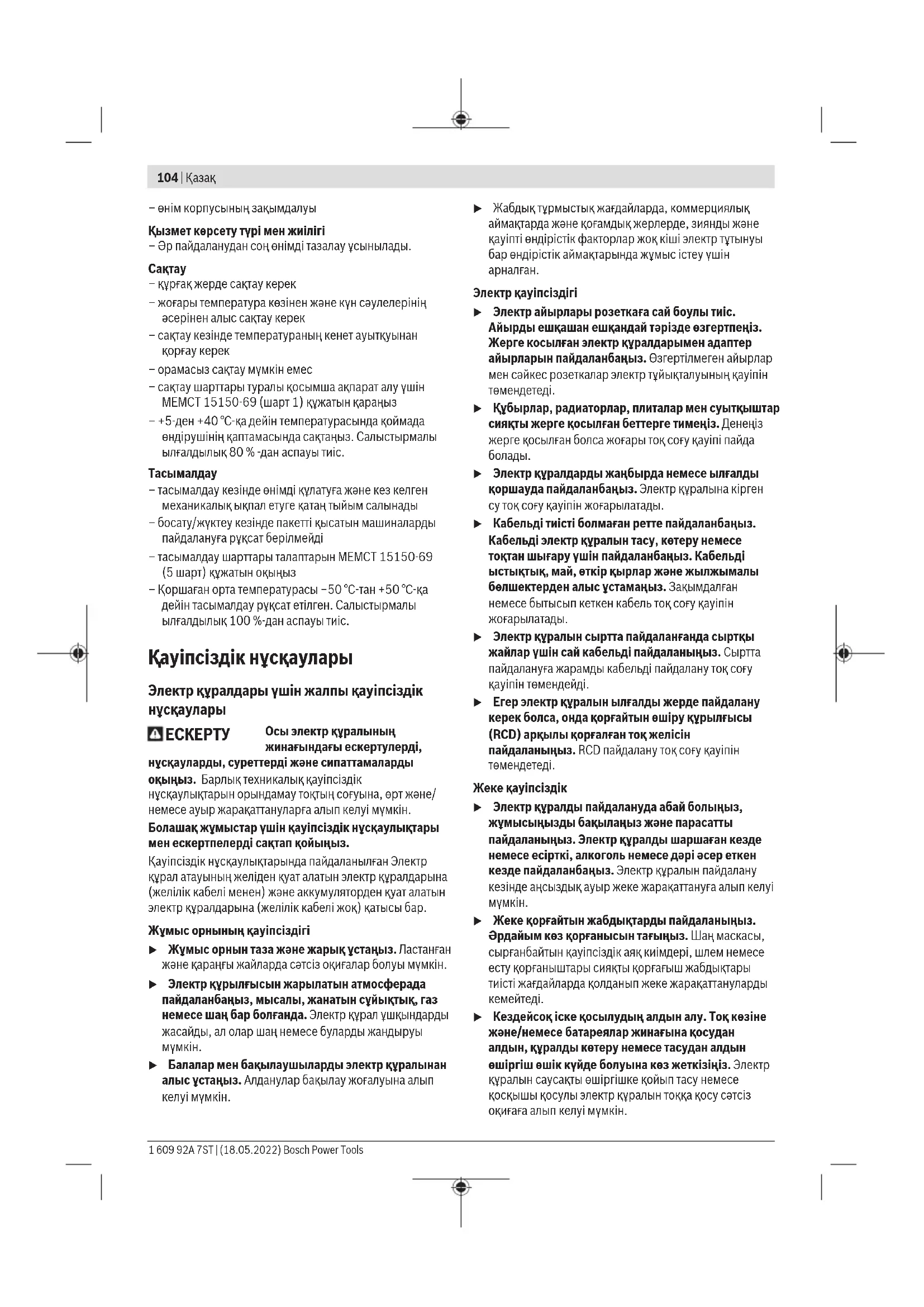 Еуразия экономикалық одағына (Кеден одағына) мүше мемлекеттер аумағында қолданылады Өндірушінің өнім үшін қарастырған пайдалану құжаттарының құрамында пайдалану жөніндегі осы нұсқаулық, сонымен бірге қосымшалар да болуы мүмкін. Сəйкестікті растау жайлы ақпарат қосымшада бар. Өнімді өндірген мемлекет туралы ақпарат өнімнің корпусында жəне қосымшада көрсетілген. Өндірілген мерзімі Нұсқаулық мұқабасының соңғы бетінде көрсетілген. Импортерге қатысты байланыс ақпарат өнім қаптамасында көрсетілген. Өнімді пайдалану мерзімі Өнімнің қызмет ету мерзімі 7жыл. Өндірілген мерзімнен бастап (өндіру күні зауыт тақтайшасында жазылған) істетпей 5жыл сақтағаннан соң, өнімді тексерусіз (сервистік тексеру) пайдалану ұсынылмайды. Көрсетілген қызмет ету мерзімі тұтынушы аталмыш нұсқаулықтың талаптарын орындаған жағдайда ғана жарамды болады. Iстен шығу себептерінің тізімі – қөп үшқын шықса, пайдаланбаңыз – қатты діріл кезінде пайдаланбаңыз – тоқ сымы бұзылған немесе оқшаулаусыз болса, пайдаланбаңыз – өнім корпусынан тікелей түтін шықса, пайдаланбаңыз Пайдаланушының мүмкін қателіктері – тұтқасы мен корпусы бұзылған болса, өнімді пайдаланбаңыз – жауын –шашын кезінде сыртта пайдаланбаңыз – корпус ішіне су кірсе құрылғыны қосушы болмаңыз Шекті күй белгілері – тоқ сымының тозуы немесе зақымдануы Bosch Power Tools 1 609 92A 7ST | (18.05.2022)104 | Қазақ – өнім корпусының зақымдалуы Қызмет көрсету түрі мен жиілігі – Әр пайдаланудан соң өнімді тазалау ұсынылады.