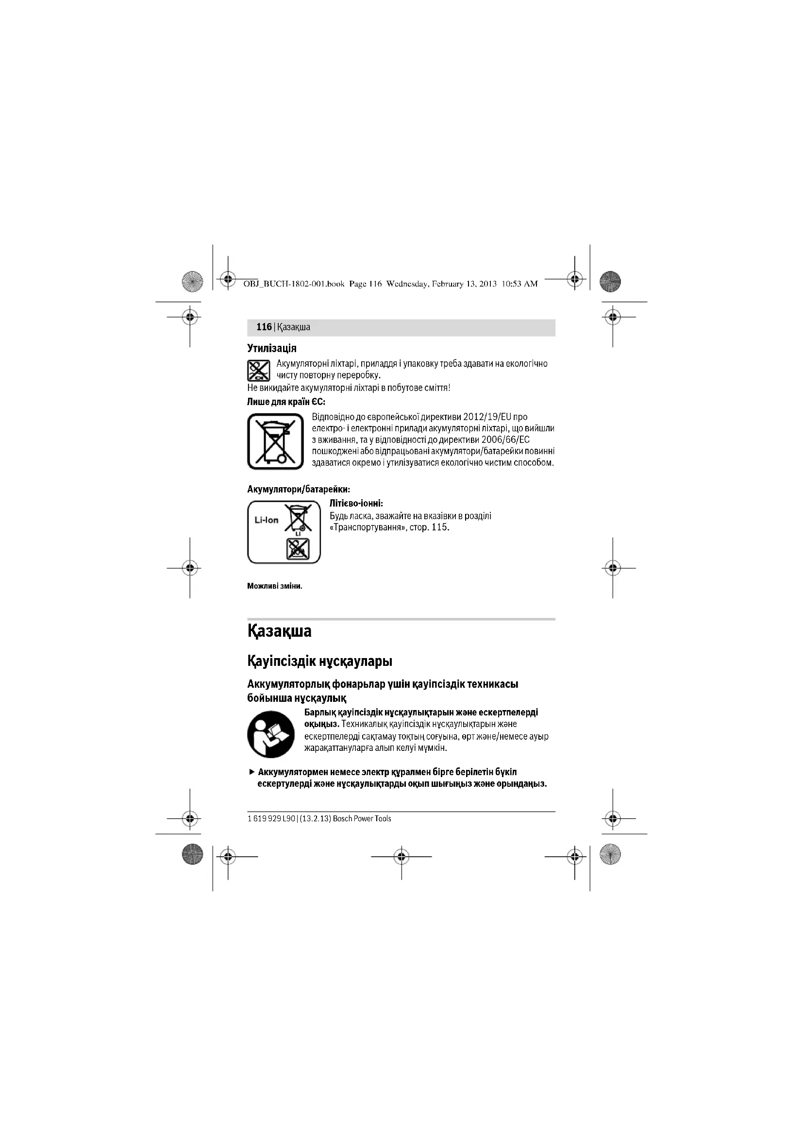 Акумуляторні ліхтарі, приладдя і упаковку треба здавати на екологічно чисту повторну переробку. Не викидайте акумуляторні ліхтарі в побутове сміття! Лише для країн ЄС: Відповідно до європейської директиви 2012/19/EU про електро- і електронні прилади акумуляторні ліхтарі, що вийшли з вживання, та у відповідності до директиви 2006/66/EС пошкоджені або відпрацьовані акумулятори/батарейки повинні здаватися окремо і утилізуватися екологічно чистим способом. Акумулятори/батарейки: Літієво-іонні: Будь ласка, зважайте на вказівки в розділі «Транспортування», стор. 115. Можливі зміни. Қaзақша Қауіпсіздік нұсқаулары Аккумуляторлық фонарьлар үшін қауіпсіздік техникасы бойынша нұсқаулық Барлық қауіпсіздік нұсқаулықтарын және ескертпелерді оқыңыз. Техникалық қауіпсіздік нұсқаулықтарын және ескертпелерді сақтамау тоқтың соғуына, өрт және/немесе ауыр жарақаттануларға алып келуі мүмкін. Аккумулятормен немесе электр құралмен бірге берілетін бүкіл ескертулерді және нұсқаулықтарды оқып шығыңыз және орындаңыз. OBJ_BUCH-1802-001.book Page 116 Wednesday, February 13, 2013 10:53 AMҚaзақша | 117 Bosch Power Tools 1 619 929 L90 | (13.2.13) Аккумуляторлық фонарьды күтіп пайдаланыңыз. Аккумуляторлық фонарь қатты қызады, бұл өрт және жарылу қаупін арттырады. Аккумуляторлық батареямен жарылыс қаупі жоқ ортада жұмыс істеңіз. Автоматты өшуден кейін аккумуляторлық фонарьдың қосқышын/өшіргішін баспаңыз. Аккумулятор зақымдалуы мүмкін. Жарық сәулесін адамдарға немесе жануарларға бағыттамаңыз және тіпті алыстан болсын жарық сәулесіне өзіңіз қарамаңыз. Тек түпнұсқа Bosch керек-жарақтарын пайдаланыңыз. Аккумуляторлық фонарьды пайдалану кезінде фонарьдың жарық басын жаппаңыз. Пайдалану кезінде фонарьдың жарық басы қызады және әбден қызса, күйіктердің себебі болуы мүмкін. Жол қозғалысы кезінде аккумуляторлық фонарьды пайдаланбаңыз. Аккумуляторлық фонарь жолда жарықтандыруға арналмаған. Аккумуляторлық фонарьмен кез келген жұмыстарды (мысалы, орнату, қызмет көрсету және т.б.) бастамай тұрып, сондай-ақ, аккумуляторлық фонарьды тасымалдау және сақтау кезінде аккумуляторды алыңыз. Балалардың аккумуляторлық батареяны пайдалануына жол бермеңіз. Ол кәсіби пайдалануға арналған. Балалар кездейсоқ өздерінің немесе адамдардың көзін шағылыстыруы мүмкін. НАЗАР АУДАРЫҢЫЗ! Жарық сәулесіне ұзақ уақыт бойы қарамаңыз. Оптикалық сәулелену көздерге зиян тигізуі мүмкін. Аккумуляторды ашпаңыз. Қысқа тұйықталу қаупі бар. Мысалы, аккумуляторды жылудан, сондай-ақ, үздіксіз күн жарығынан, оттан, судан және ылғалдан қорғаңыз. Жарылу қаупі