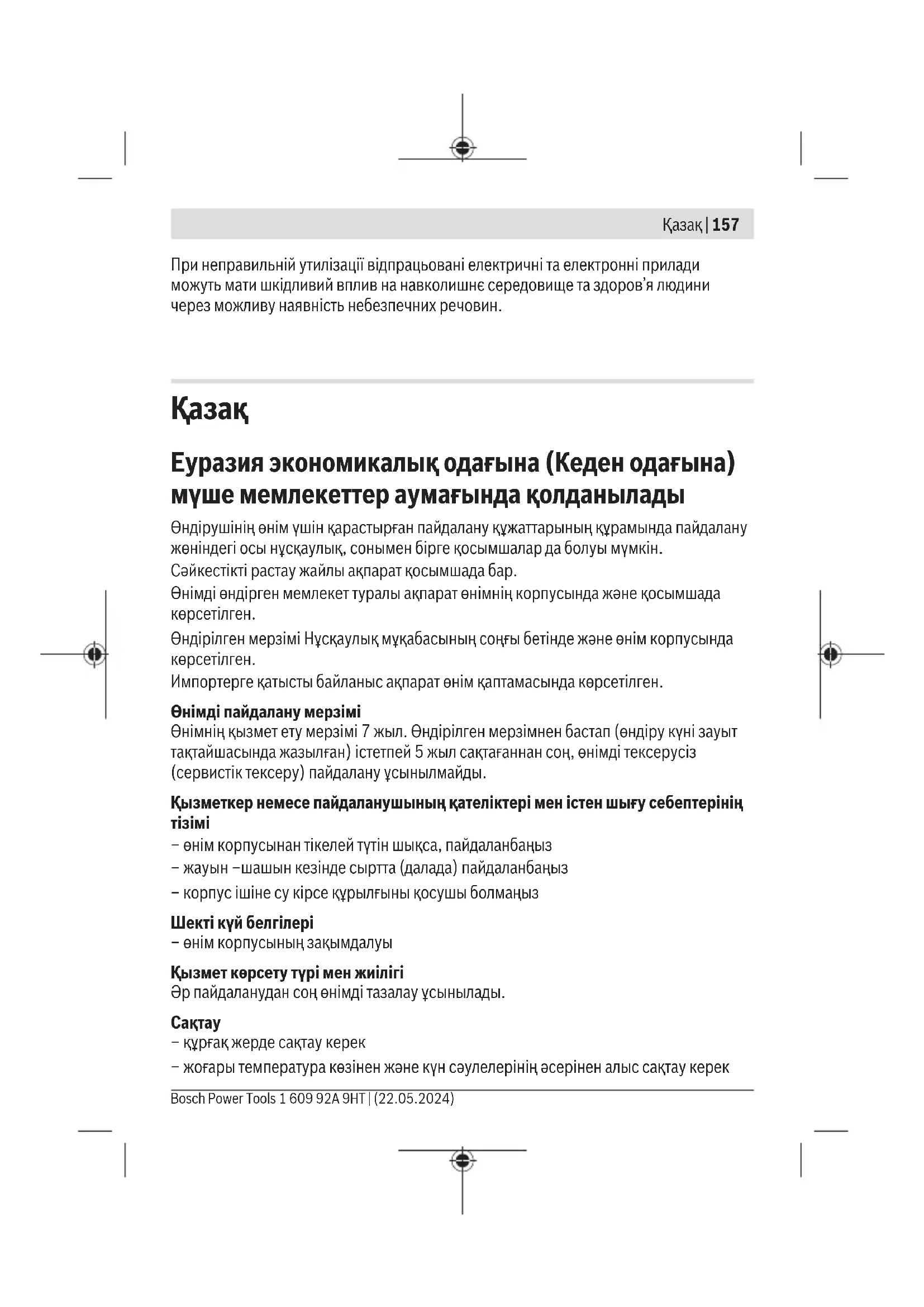 – құрғақ жерде сақтау керек – жоғары температура көзінен және күн сәулелерінің әсерінен алыс сақтау керек Bosch Power Tools 1 609 92A 9HT | (22.05.2024)158 | Қазақ – сақтау кезінде температураның кенет ауытқуынан қорғау керек – егер құрал жұмсақ сөмке немесе пластик кейсте жеткізілсе оны осы өзінің қорғағыш қабында сақтау ұсынылады – сақтау шарттары туралы қосымша ақпарат алу үшін МЕМСТ 15150-69 (Шарт 1) құжатын қараңыз