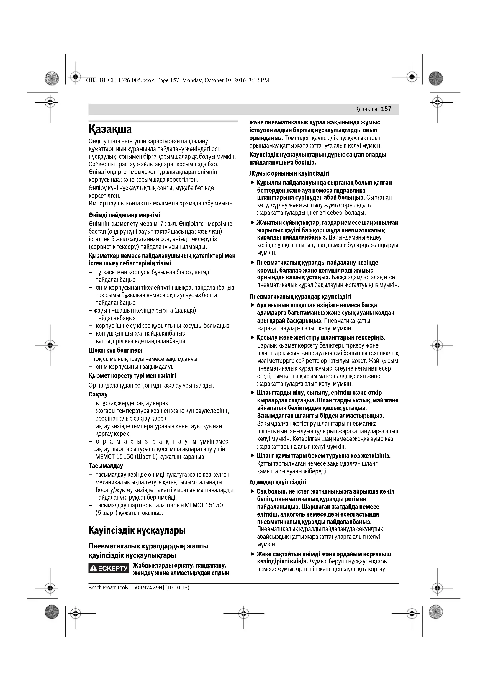OBJ_BUCH-1326-005.book Page 157 Monday, October 10, 2016 3:12 PM158 | Қaзақша 1 609 92A 39N | (10.10.16) Bosch Power Tools ережелері бойынша шаңтұтқыш, сырғудан сақтайтын бәтеңке, сақтайтын шлем немесе құлақ сақтағышы сияқты жеке қорғаныс жабдықтарын кию жарақаттану қаупін төмендетеді. Байқаусыз пайдаланудан аулақ болыңыз. Пневматикалық құралды ауа жетістіруіне қосудан, оны көтергенден немесе алып жүргенден алдын өшірулі болуына көз жеткізіңіз. Пневматикалық құралды көтеріп тұрғанда, бармақты косқыш/өшіргіште ұстау немесе пневматика құралын қосулы күйде ауа жетістіруіне қосу, жазатайым оқиғаға алып келуі
