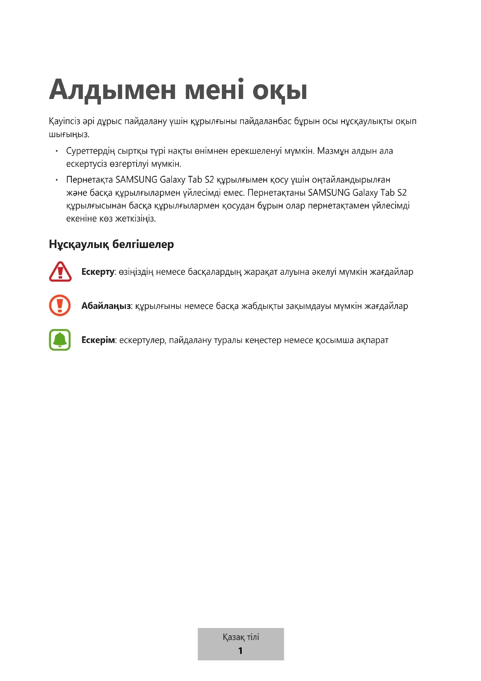 Пернетақта SAMSUNG Galaxy Tab S2 құрылғымен қосу үшін оңтайландырылған және басқа құрылғылармен үйлесімді емес. Пернетақтаны SAMSUNG Galaxy Tab S2 құрылғысынан басқа құрылғылармен қосудан бұрын олар пернетақтамен үйлесімді екеніне көз жеткізіңіз. Нұсқаулық белгішелер Ескерту: өзіңіздің немесе басқалардың жарақат алуына әкелуі мүмкін жағдайлар Абайлаңыз: құрылғыны немесе басқа жабдықты зақымдауы мүмкін жағдайлар Ескерім: ескертулер, пайдалану туралы кеңестер немесе қосымша ақпарат