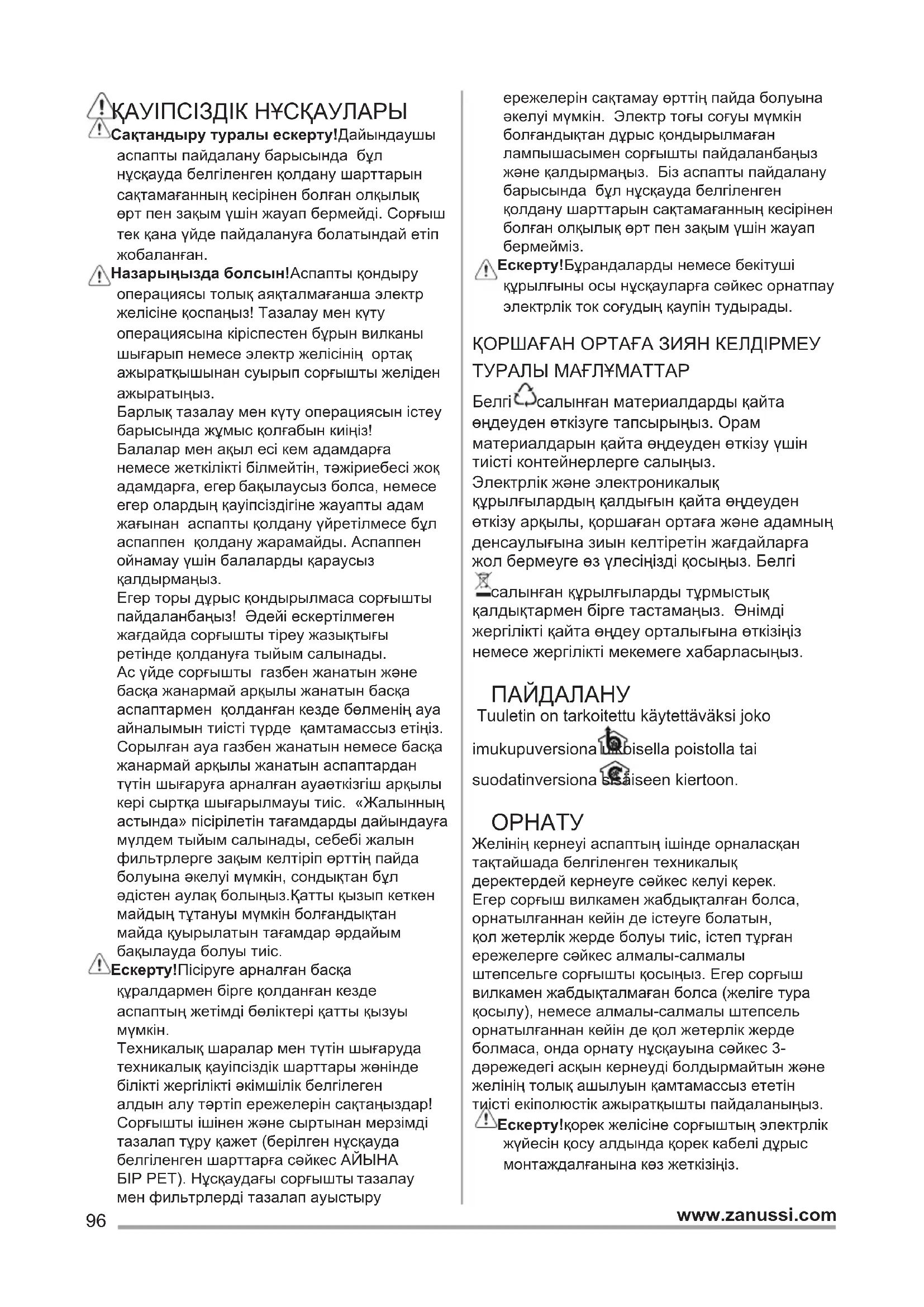 ПАЙДАЛАНУШЫ НҰСҚАУЛЫҒЫ ZHP62370XA ZANUSSI