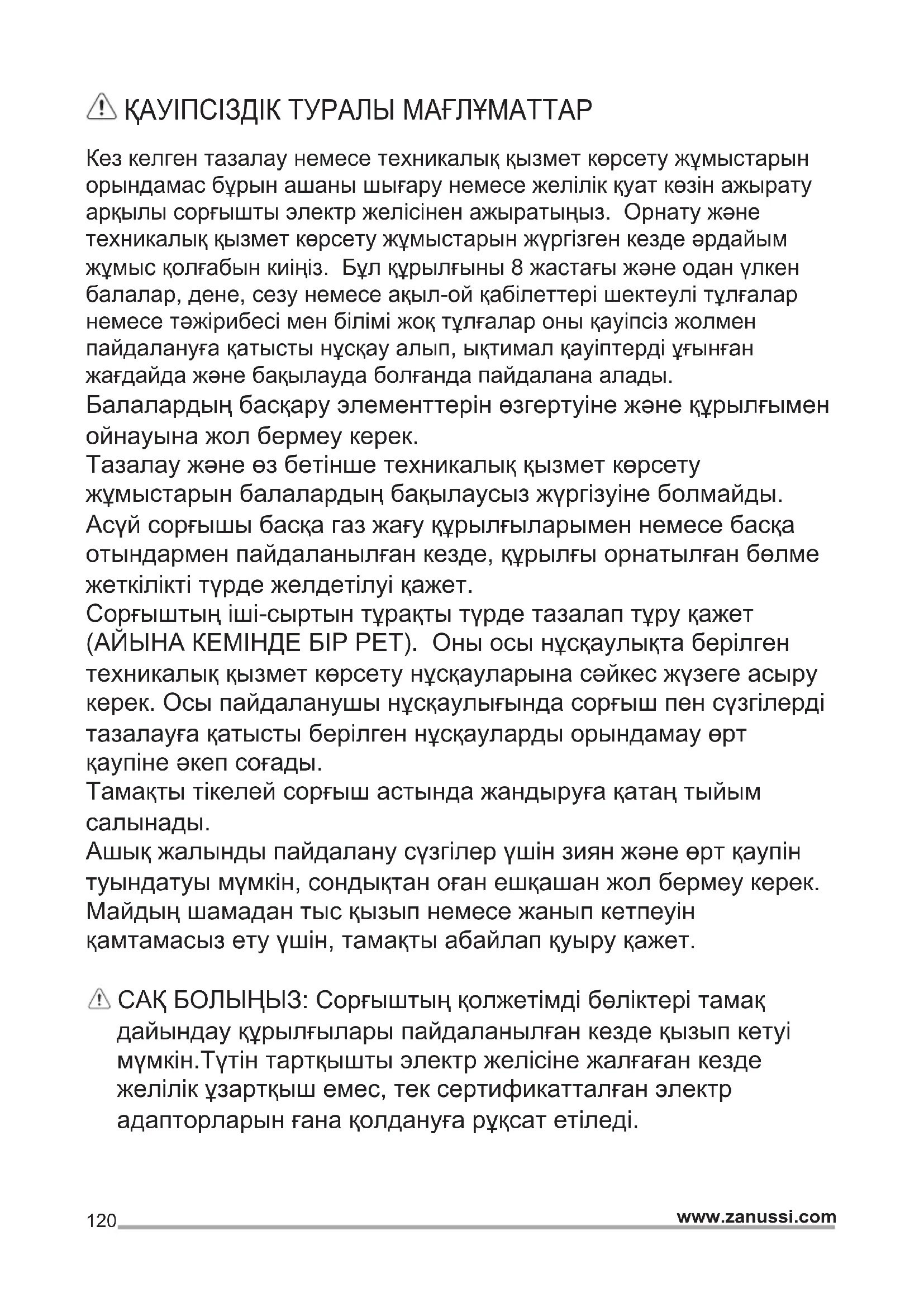 Щодо їх заміни звертайтеся до служби технічного обслуговування.120 www.zanussi.com ҚАУІПСІЗДІК ТУРАЛЫ МАҒЛҰМАТТАР Кез келген тазалау немесе техникалық қызмет көрсету жұмыстарын орындамас бұрын ашаны шығару немесе желілік қуат көзін ажырату арқылы сорғышты электр желісінен ажыратыңыз. Орнату және техникалық қызмет көрсету жұмыстарын жүргізген кезде әрдайым жұмыс қолғабын киіңіз. Бұл құрылғыны 8 жастағы және одан үлкен балалар, дене, сезу немесе ақыл-ой қабілеттері шектеулі тұлғалар немесе тәжірибесі мен білімі жоқ тұлғалар оны қауіпсіз жолмен пайдалануға қатысты нұсқау алып, ықтимал қауіптерді ұғынған жағдайда және бақылауда болғанда пайдалана алады. Балалардың басқару элементтерін өзгертуіне және құрылғымен ойнауына жол бермеу керек. Тазалау және өз бетінше техникалық қызмет көрсету жұмыстарын балалардың бақылаусыз жүргізуіне болмайды. Асүй сорғышы басқа газ жағу құрылғыларымен немесе басқа отындармен пайдаланылған кезде, құрылғы орнатылған бөлме жеткілікті түрде желдетілуі қажет. Сорғыштың іші-сыртын тұрақты түрде тазалап тұру қажет (АЙЫНА КЕМІНДЕ БІР РЕТ). Оны осы нұсқаулықта берілген техникалық қызмет көрсету нұсқауларына сәйкес жүзеге асыру керек. Осы пайдаланушы нұсқаулығында сорғыш пен сүзгілерді тазалауға қатысты берілген нұсқауларды орындамау өрт қаупіне әкеп соғады. Тамақты тікелей сорғыш астында жандыруға қатаң тыйым