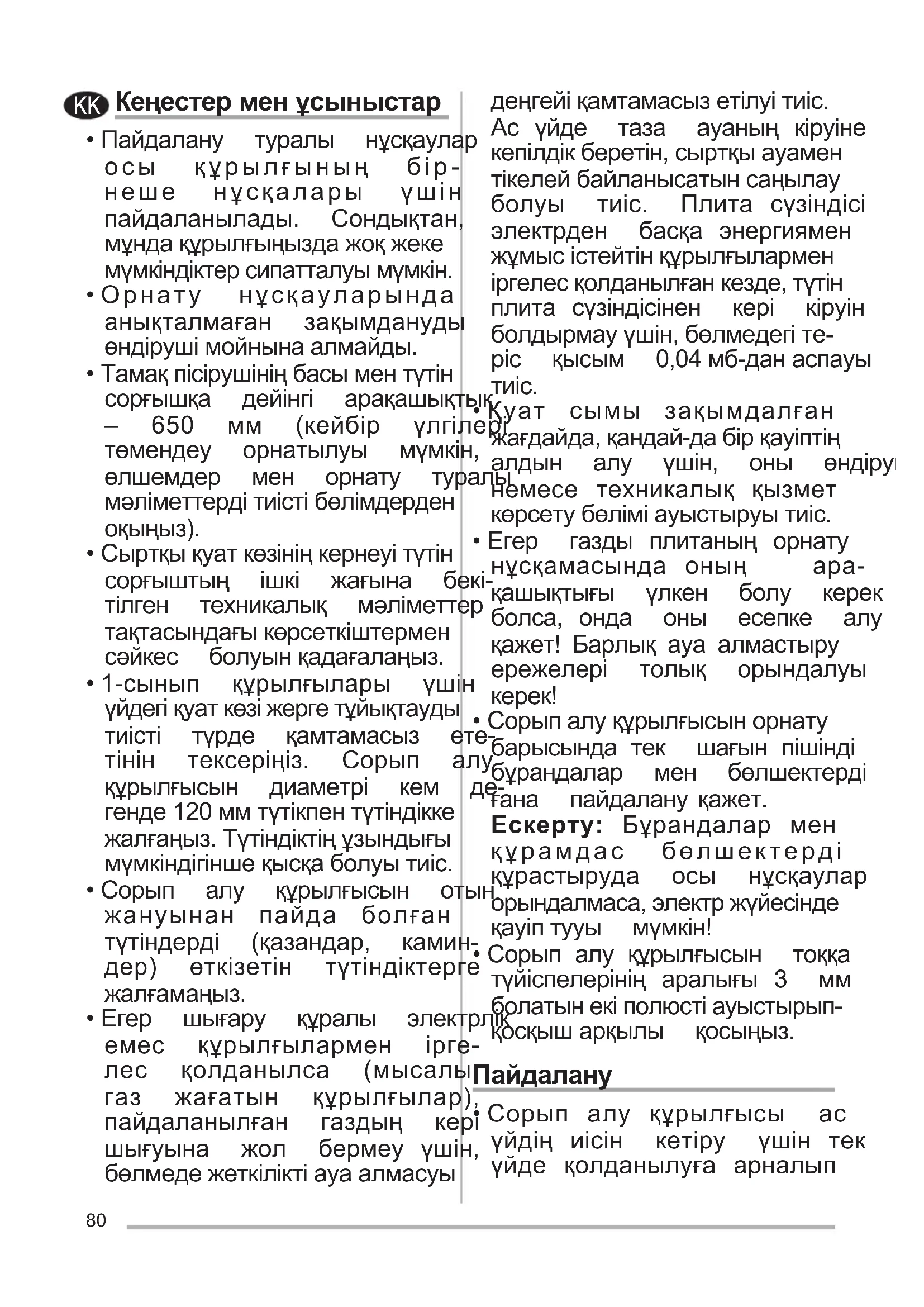 - Егер шығару құралы электрлік емес құрылғылармен ірге- лес қолданылса (мысалы, газ жағатын құрылғылар), пайдаланылған газдың кері шығуына жол бермеу үшін, бөлмедежеткіліктіауаалмасуы деңгейіқамтамасызетілуітиіс. Ас үйде таза ауаның кіруіне кепілдікберетін,сыртқыауамен тікелейбайланысатынсаңылау болуы тиіс. Плита сүзіндісі электрден басқа энергиямен жұмысістейтінқұрылғылармен іргелесқолданылғанкезде,түтін плита сүзіндісінен кері кіруін болдырмауүшін,бөлмедегіте- ріс қысым 0,04мб-данаспауы