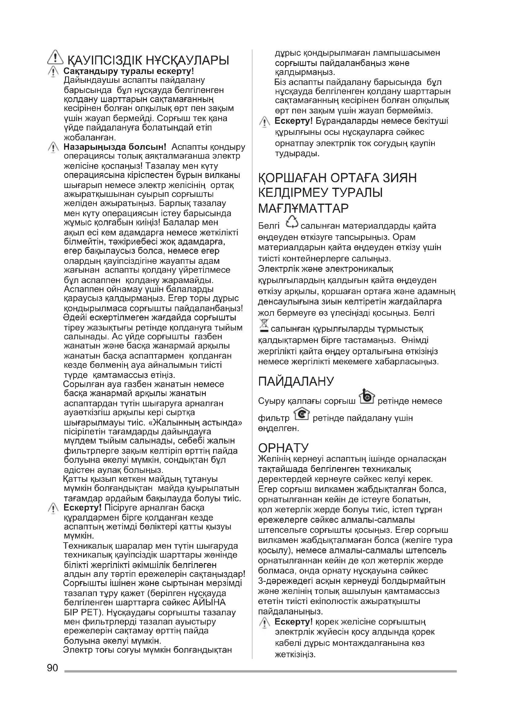 Техникалық шаралар мен түтін шығаруда техникалық қауіпсіздік шарттары жөнінде білікті жергілікті əкімшілік белгілеген алдын алу тəртіп ережелерін сақтаңыздар! Сорғышты ішінен жəне сыртынан мерзімді тазалап тұру қажет (берілген нұсқауда белгіленген шарттарға сəйкес АЙЫНА БІР РЕТ). Нұсқаудағы сорғышты тазалау мен фильтрлерді тазалап ауыстыру ережелерін сақтамау өрттің пайда болуына əкелуі мүмкін. Электр тоғы соғуы мүмкін болғандықтан дұрыс қондырылмаған лампышасымен сорғышты пайдаланбаңыз жəне қалдырмаңыз. Біз аспапты пайдалану барысында бұл нұсқауда белгіленген қолдану шарттарын сақтамағанның кесірінен болған олқылық өрт пен зақым үшін жауап бермейміз. Ескерту! Бұрандаларды немесе бекітуші құрылғыны осы нұсқауларға сəйкес орнатпау электрлік ток соғудың қаупін