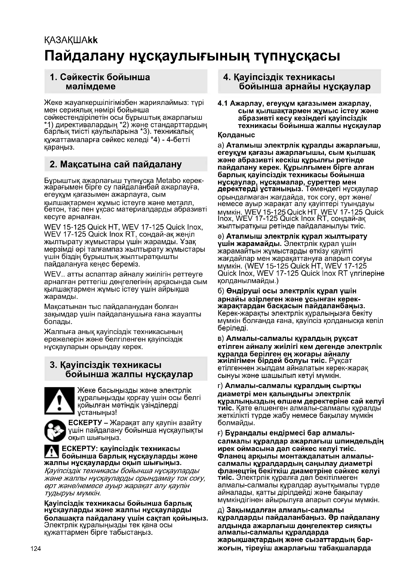 а) Аталмыш электрлік құралды ажарлағыш, егеуқұм қағазы ажарлағышы, сым қылшақ және абразивті кескіш құрылғы ретінде пайдалану керек. Құрылғымен бірге алған барлық қауіпсіздік техникасы бойынша нұсқаулар, нұсқамалар, суреттер мен деректерді ұстаныңыз. Төмендегі нұсқаулар орындалмаған жағдайда, ток соғу, өрт және/ немесе ауыр жарақат алу қауіптері туындауы мүмкін. WEV 15-125 Quick HT, WEV 17-125 Quick Inox, WEV 17-125 Quick Inox RT, сондай-ақ жылтыратқыш ретінде пайдаланылуы тиіс. ә) Аталмыш электрлік құрал жылтырату үшін жарамайды. Электрлік құрал үшін жарамайтын жұмыстарды өткізу қауіпті жағдайлар мен жарақаттануға апарып соғуы мүмкін. (WEV 15-125 Quick HT, WEV 17-125 Quick Inox, WEV 17-125 Quick Inox RT үлгілеріне қолданылмайды.) б) Өндіруші осы электрлік құрал үшін арнайы әзірлеген және ұсынған керек- жарақтардан басқасын пайдаланбаңыз. Керек-жарақты электрлік құралыңызға бекіту мүмкін болғанда ғана, қауіпсіз қолданысқа кепіл