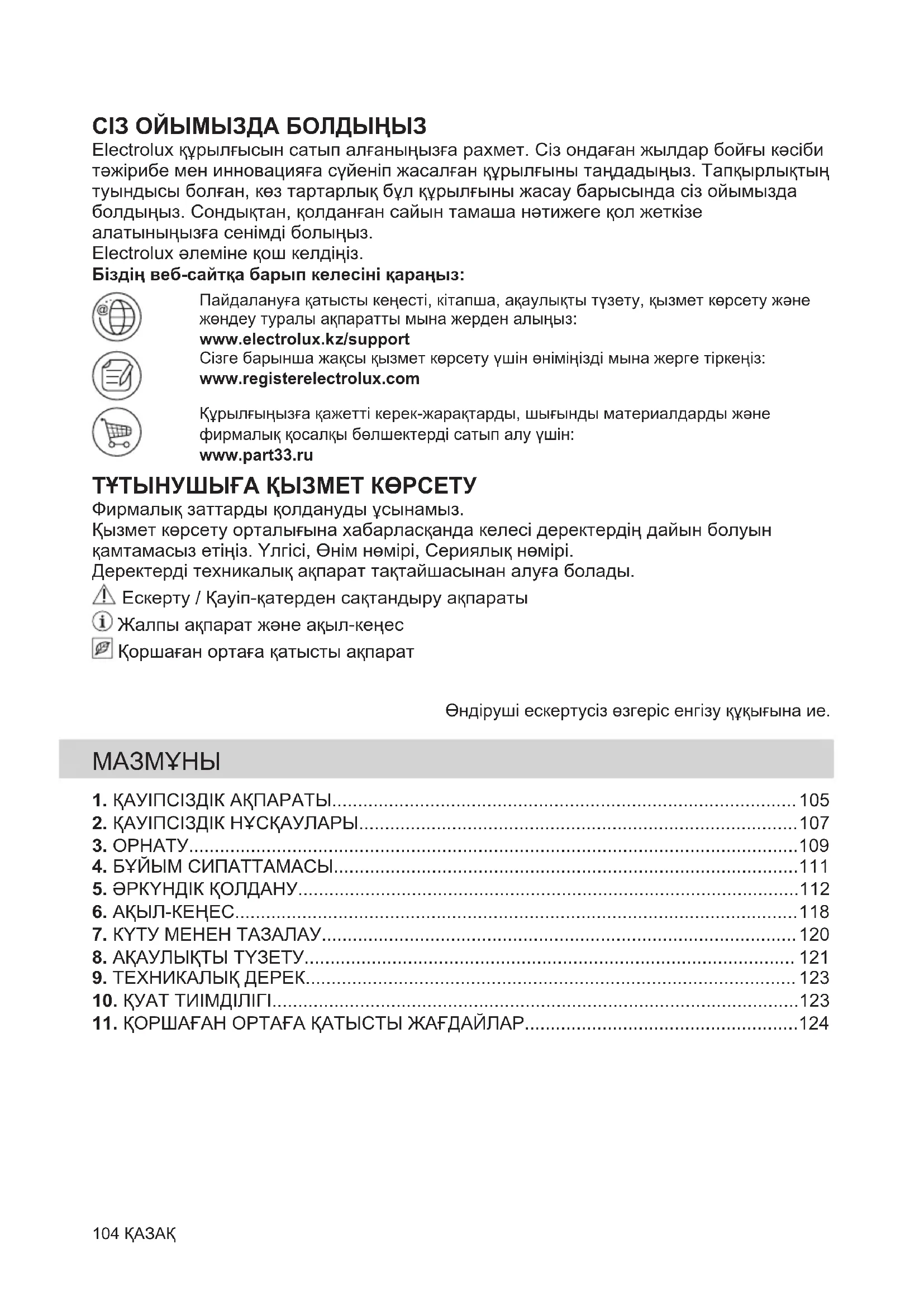 Riciclare i materiali con il simbolo . Buttare l'imballaggio negli appositi contenitori per il riciclaggio. Aiutare a proteggere l’ambiente e la salute umana e a riciclare rifiuti derivanti da apparecchiature elettriche ed elettroniche. Non smaltire le apparecchiature che riportano il simbolo insieme ai normali rifiuti domestici. Portare il prodotto al punto di riciclaggio più vicino o contattare il comune di residenza. ITALIANO 103СІЗ ОЙЫМЫЗДА БОЛДЫҢЫЗ Electrolux құрылғысын сатып алғаныңызға рахмет. Сіз ондаған жылдар бойғы кәсіби тәжірибе мен инновацияға сүйеніп жасалған құрылғыны таңдадыңыз. Тапқырлықтың туындысы болған, көз тартарлық бұл құрылғыны жасау барысында сіз ойымызда болдыңыз. Сондықтан, қолданған сайын тамаша нәтижеге қол жеткізе алатыныңызға сенімді болыңыз. Electrolux әлеміне қош келдіңіз. Біздің веб-сайтқа барып келесіні қараңыз: Пайдалануға қатысты кеңесті, кітапша, ақаулықты түзету, қызмет көрсету және жөндеу туралы ақпаратты мына жерден алыңыз: www.electrolux.kz/support Сізге барынша жақсы қызмет көрсету үшін өніміңізді мына жерге тіркеңіз: www.registerelectrolux.com Құрылғыңызға қажетті керек-жарақтарды, шығынды материалдарды және фирмалық қосалқы бөлшектерді сатып алу үшін: www.part33.ru ТҰТЫНУШЫҒА ҚЫЗМЕТ КӨРСЕТУ Фирмалық заттарды қолдануды ұсынамыз. Қызмет көрсету орталығына хабарласқанда келесі деректердің дайын болуын қамтамасыз етіңіз. Үлгісі, Өнім нөмірі, Сериялық нөмірі. Деректерді техникалық ақпарат тақтайшасынан алуға болады. Ескерту / Қауіп-қатерден сақтандыру ақпараты Жалпы ақпарат және ақыл-кеңес Қоршаған ортаға қатысты ақпарат Өндіруші ескертусіз өзгеріс енгізу құқығына ие.