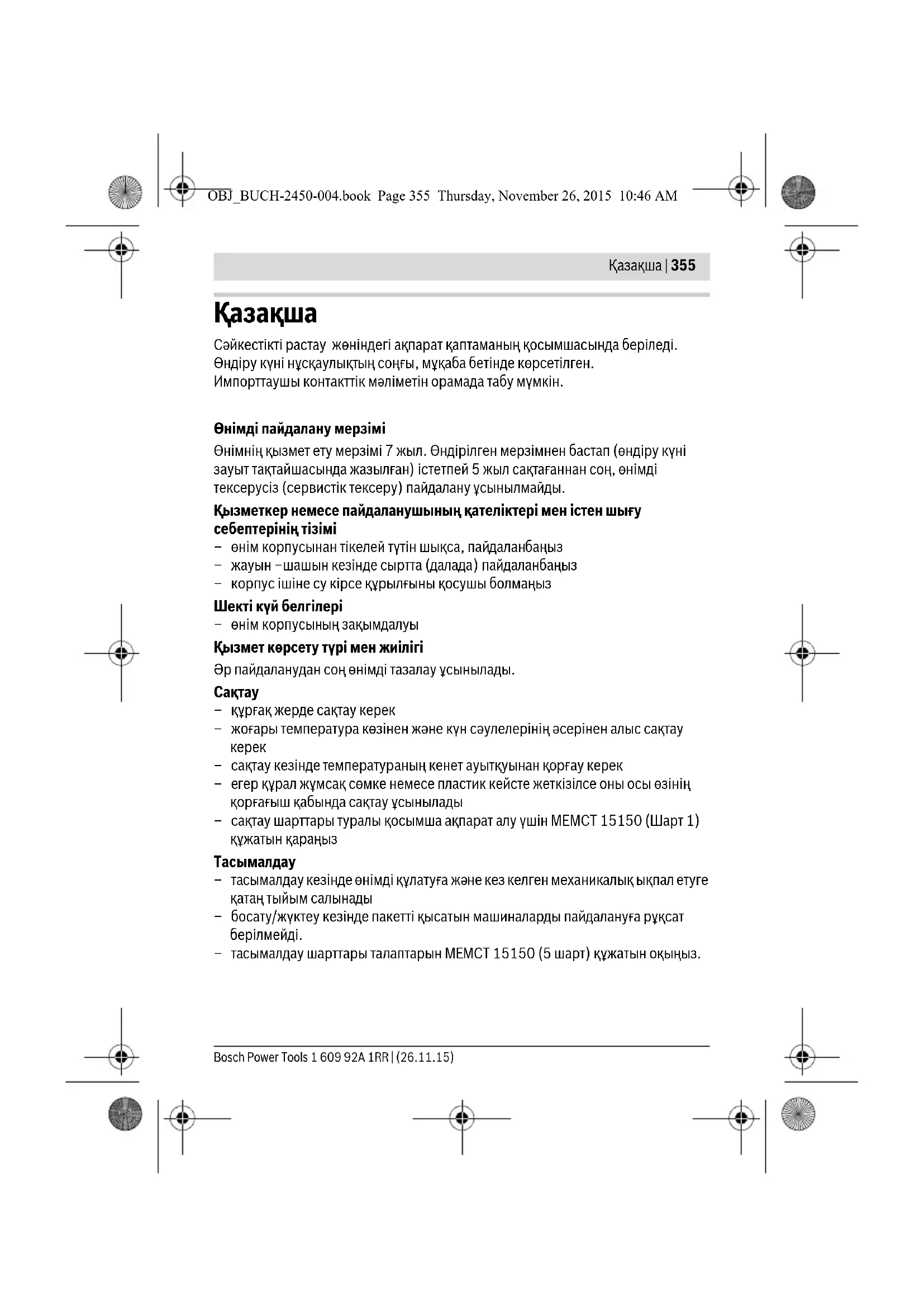 Вимірювальні прилади, приладдя і упаковку треба здавати на екологічно чисту повторну переробку. Не викидайте вимірювальні інструменти та акумуляторні батареї/батарейки в побутове сміття! Лише для країн ЄС: Відповідно до європейської директиви 2012/19/EU та європейської директиви 2006/66/EC відпрацьовані вимірювальні прилади, пошкоджені або відпрацьовані акумуляторні батареї/батарейки повинні здаватися окремо і утилізуватися екологічно чистим способом. Можливі зміни. OBJ_BUCH-2450-004.book Page 354 Thursday, November 26, 2015 10:46 AMҚaзақша | 355 Bosch Power Tools 1 609 92A 1RR | (26.11.15) Қaзақша Сәйкестікті растау жөніндегі ақпарат қаптаманың қосымшасында беріледі. Өндіру күні нұсқаулықтың соңғы, мұқаба бетінде көрсетілген. Импорттаушы контакттік мәліметін орамада табу мүмкін. Өнімді пайдалану мерзімі Өнімнің қызмет ету мерзімі 7 жыл. Өндірілген мерзімнен бастап (өндіру күні зауыт тақтайшасында жазылған) істетпей 5 жыл сақтағаннан соң, өнімді тексерусіз (сервистік тексеру) пайдалану ұсынылмайды. Қызметкер немесе пайдаланушының қателіктері мен істен шығу себептерінің тізімі – өнім корпусынан тікелей түтін шықса, пайдаланбаңыз – жауын –шашын кезінде сыртта (далада) пайдаланбаңыз –корпус ішіне су кірсе құрылғыны қосушы болмаңыз Шекті күй белгілері – өнім корпусын ың зақымдалуы Қызмет көрсету түрі мен жиілігі Әр пайдаланудан соң өнімді тазалау ұсынылады.