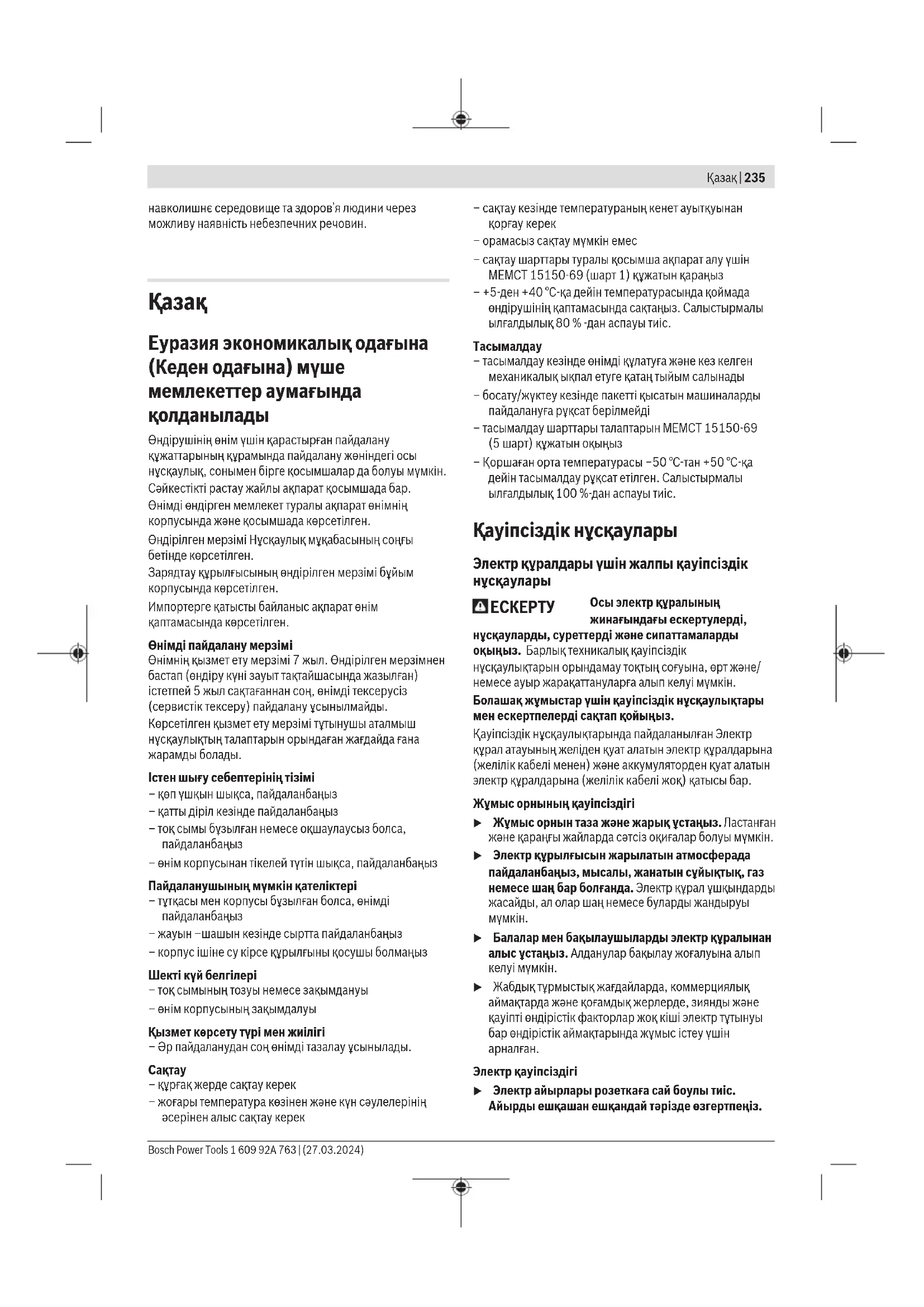 u Аспап өндірушімен жасалмаған немесе ұсынбаған керек-жарақтарды пайдаланбаңыз. Керек-жарақ электр құралыңызға сай келсе де, қауіпсіз жұмыс істеу қамтамасыз етілмейді. u Жұмыс құралы айналымдарының ұйғарынды саны электр·құралында·көрсетілген максималды айналымдар санына ·тең·болуы·керек. Есептелген жылдамдығынан тезірек істеп тұрған керек-жарақтар сынуы, ұшып кетуі мүмкін. u Пайдаланатын жұмыс құралының сыртқы·диаметрі мен·қалыңдығы электр·құралының·өлшемдеріне сай·болуы·керек. Дұрыс таңдалмаған керек – жарақтар дұрыс·қорғалмауы жəне·бақылаудан шығуы мүмкін. u Қосымша бекіткіштің өлшемдері электр құралының монтаждық жабдығының өлшемдеріне сәйкес келуі тиіс. Электр құралының монтаждық Bosch Power Tools 1 609 92A 763 | (27.03.2024)238 | Қазақ жабдығына сәйкес келмейтін керек-жарақтар тепе- теңдіктен айырылуы, тым қатты дірілдеуі және бақылау мүмкіндігінен айырылуға әкеле алады. u Зақымдалған керек-жарақтарды пайдаланбаңыз. Әр пайдаланудан алдын абразивті дөңгелек сияқты керек-жарақтарды сынық пен жарықтарға, етек дискіні жарықтарға, тозу немесе артықшылықтарына, сым қылшақты бос немесе сынған сымдарға тексеріңіз. Егер электр құралы немесе керек-жарақтар түсіп кетсе, оның зақымдалмағанын тексеріңіз, қажет болса зақымдалмаған керек-жарақтарды орнатыңыз. Керек-жарақтарды тексеріп орнатудан соң, өзіңізді және басқа адамдарды айналып тұрған керек- жарақтар аймағынан алыстатып, электр құралын максималды жүктеусіз жылдамдықпен бір минут айналдырыңыз. Зақымдалған керек-жарақтар әдетте сынақ уақытында сынады. u Жеке·қорғаныс жабдығын киіп жүріңіз. Пайдалану тәсіліне байланысты қорғаныш масканы немесе қауіпсіздік көзілдірігін қолданыңыз. Қажет болғанда, шаңнан қорғайтын масканы, құлақ қорғағыштарын, қолғап және кіші абразивті бөлшектерді немесе дайындама бөлшектерін ұстай алатын шеберхана алжапқышын пайдаланыңыз. Көз қорғанысы әртүрлі әрекеттердің барысында пайда болатын ұшпа·қоқысты тоқтатуға қабілетті болуы тиіс. Шаңнан қорғайтын маска немесе респиратор белгілі бір жұмыс өткізгенде пайда болатын ұсақ бөлшектерді сүзгілеуге қабілетті болуы тиіс. Өте қарқынды шудың әсері есту·қабілетінің жоғалуына әкелуі мүмкін. u Бөтен ·адамдардың жұмыс·аймағынан·қауіпсіз аймақта болуын қамтамасыз етіңіз. Жұмыс аймағына кіретін кез келген адам жеке қорғағыш жабдықтарды киюі керек. Дайындама бөлшектері немесе сынған керек-жарақтар ұшып, әрекет аймағынан тыс жайда жақарат тигізуі мүмкін. u Кесетін керек-жарақтан жасырын сымдар немесе өз сымына тиюі мүмкін әрекеттерді жасаған кезде электр құрылы оқшауланған ұстау жайынан ұстаңыз. Егер кесуші аспап істеп тұрған сымға тисе электр құралының метал бөлшектерін істетіп пайдаланушыны тоқ соғуы мүмкін. u Кескіш керек-жарақтың жасырын сымдарға тиюіне әкелуі мүмкін жұмысты өткізген кезде, электр құралын тек оқшауланған беттерінен ұстаңыз. Қуаттандырылған сымға тиген жағдайда, электр құралының шығып тұрған металл бөлшектерін де қуаттандырып, пайдаланушыны ток соғуы мүмкін. u Кабельді айналып тұрған аспаптардан алыс ұстаңыз. Бақылауды жоғалтсаңыз, кабель кесіліп немесе тартылып кетіп, қолыңыз айналып тұрған аспапқа тартылуы мүмкін. u Айналып тұрған аспап толық тоқтағанша электр құралын қоймаңыз. Айналып тұрған керек-жарақтар бетке тиіп, электр құралы бақылаудан шығуы мүмкін. u Элект