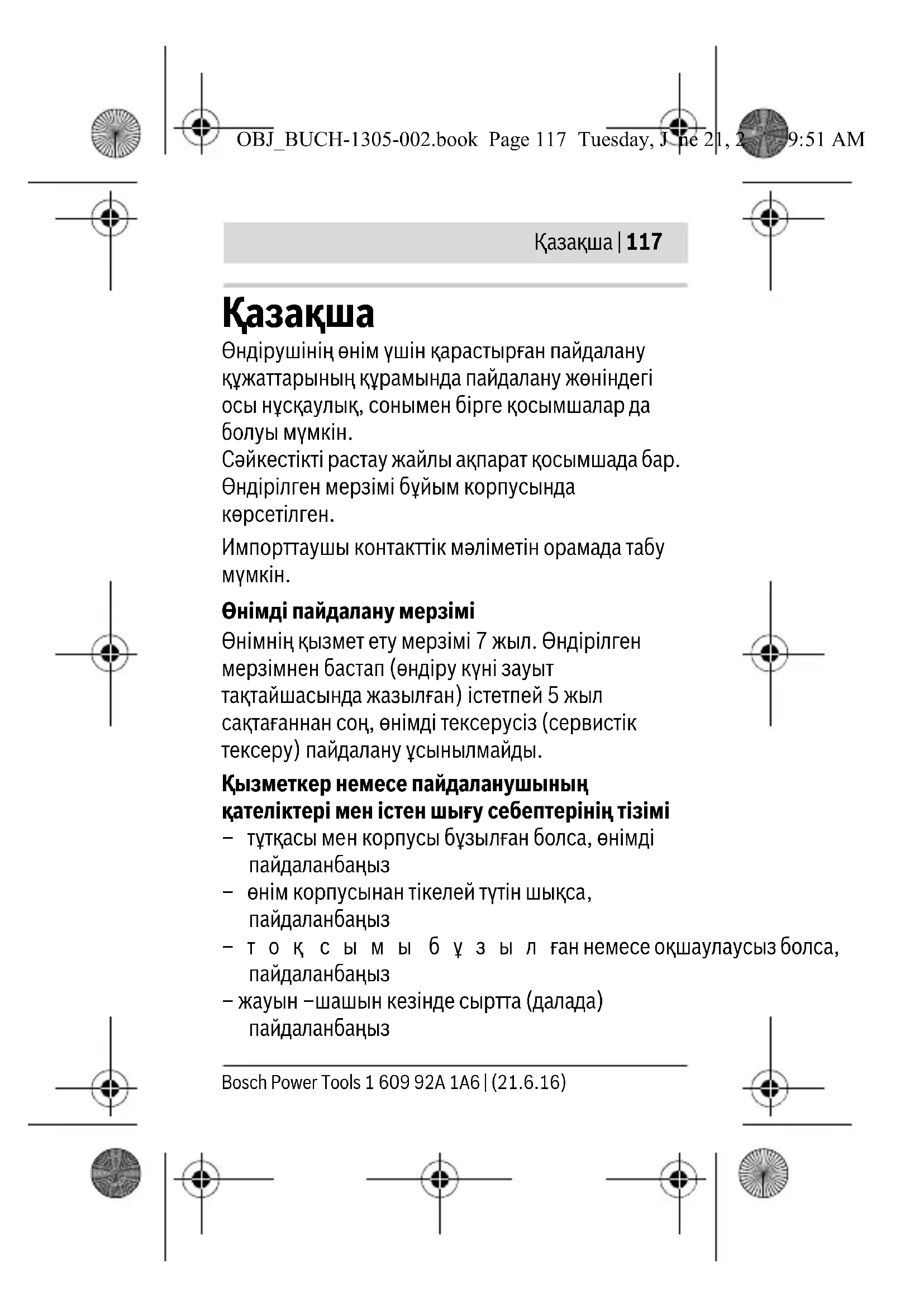 Өнімді пайдалану мерзімі Өнімнің қызмет ету мерзімі 7 жыл. Өндірілген мерзімнен бастап (өндіру күні зауыт тақтайшасында жазылған) істетпей 5 жыл сақтағаннан соң, өнімді тексерусіз (сервистік тексеру) пайдалану ұсынылмайды. Қызметкер немесе пайдаланушының қателіктері мен істен шығу себептерінің тізімі – тұтқасы мен корпусы бұзылған болса, өнімді пайдаланбаңыз – өнім корпусынан тікелей түтін шықса, пайдаланбаңыз –тоқ сымы бұзылған немесе оқшаулаусыз болса, пайдаланбаңыз – жауын –шашын кезінде сыртта (далада) пайдаланбаңыз OBJ_BUCH-1305-002.book Page 117 Tuesday, June 21, 2016 9:51 AM118 | Қaзақша 1 609 92A 1A6 | (21.6.16) Bosch Power Tools – корпус ішіне су кірсе құрылғыны қосушы