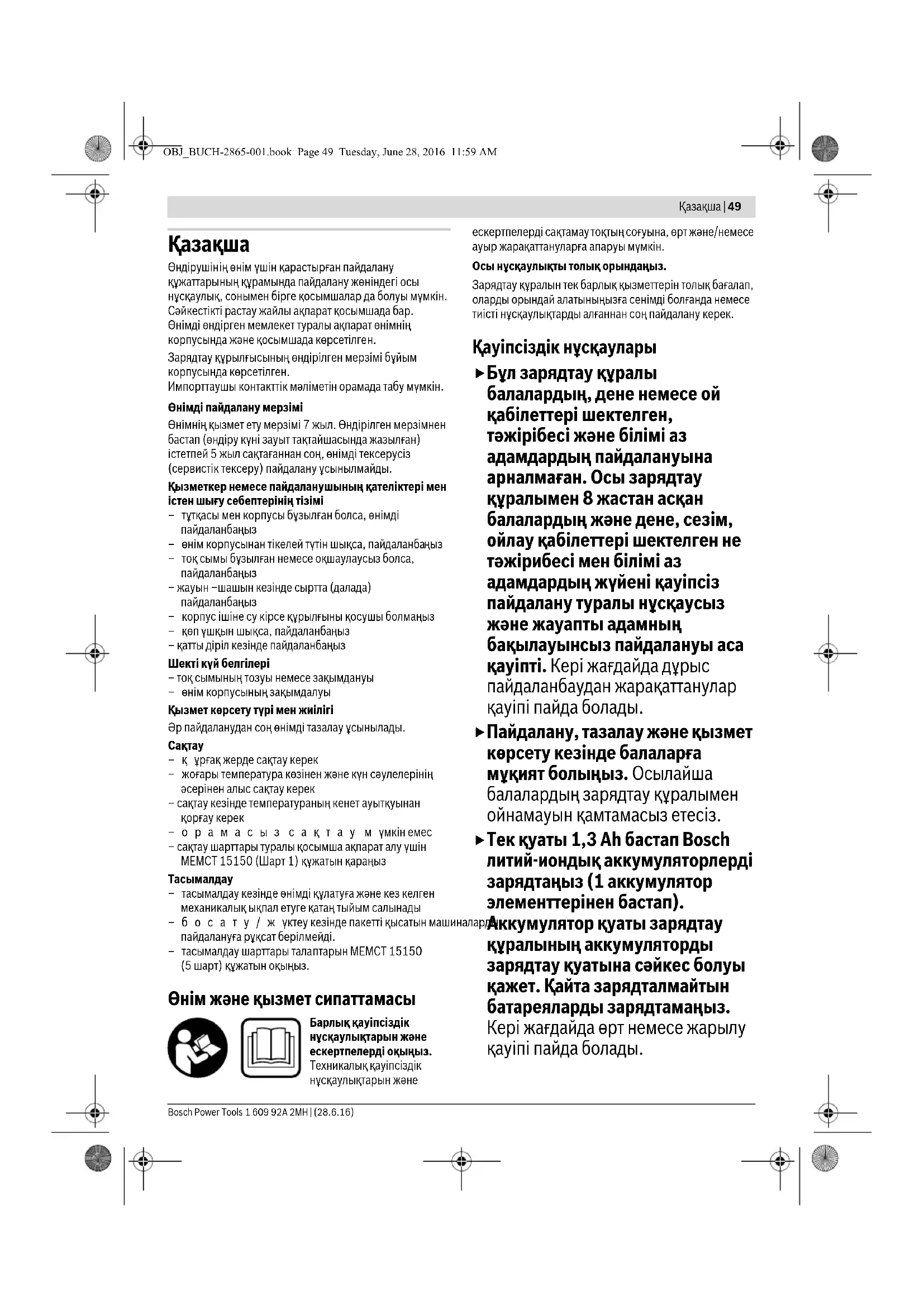 Перевірте напругу в мережі та за необхідністю перевірте зарядний пристрій в сервісній майстерні для електроприладів Bosch Причина Що робити OBJ_BUCH-2865-001.book Page 48 Tuesday, June 28, 2016 11:59 AMҚaзақша | 49 Bosch Power Tools 1 609 92A 2MH | (28.6.16) Қaзақша Өндірушінің өнім үшін қарастырған пайдалану құжаттарының құрамында пайдалану жөніндегі осы нұсқаулық, сонымен бірге қосымшалар да болуы мүмкін. Сәйкестікті растау жайлы ақпарат қосымшада бар. Өнімді өндірген мемлекет туралы ақпарат өнімнің корпусында және қосымшада көрсетілген. Зарядтау құрылғысының өндірілген мерзімі бұйым корпусында көрсетілген. Импорттаушы контакттік мәліметін орамада табу мүмкін. Өнімді пайдалану мерзімі Өнімнің қызмет ету мерзімі 7 жыл. Өндірілген мерзімнен бастап (өндіру күні зауыт тақтайшасында жазылған) істетпей 5 жыл сақтағаннан соң, өнімді тексерусіз (сервистік тексеру) пайдалану ұсынылмайды. Қызметкер немесе пайдаланушының қателіктері мен істен шығу себептерінің тізімі –тұтқасы мен корпусы бұзылған болса, өнімді пайдаланбаңыз – өнім корпусынан тікелей түтін шықса, пайдаланба