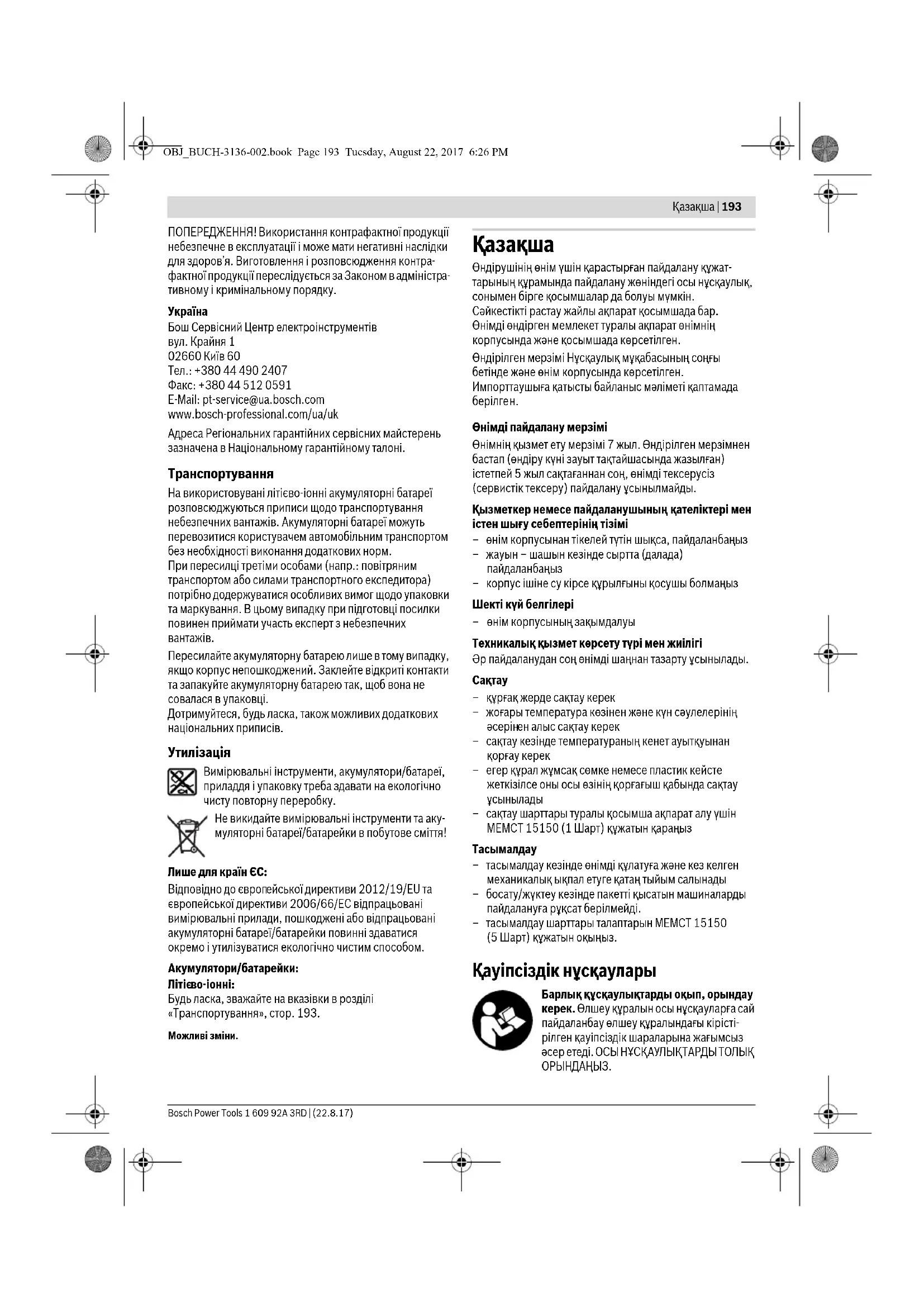 30 5,1 x 3,8 OBJ_BUCH-3136-002.book Page 202 Tuesday, August 22, 2017 6:26 PMҚaзақша | 203 Bosch Power Tools 1 609 92A 3RD | (22.8.17) Тұтынушыға қызмет көрсету және пайдалану
