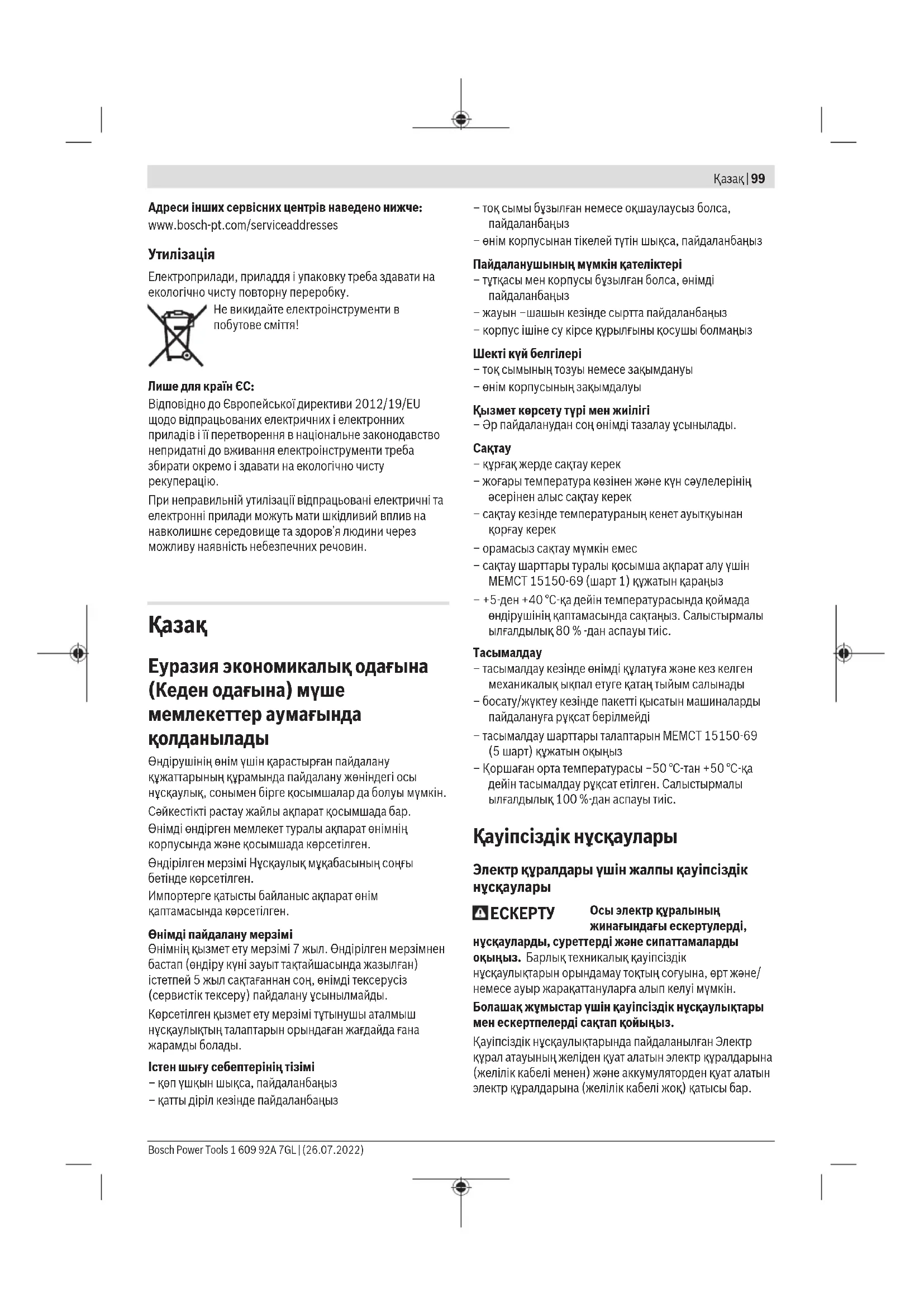 Сұрақтар қою және қосалқы бөлшектерге тапсырыс беру кезінде міндетті түрде өнімнің фирмалық тақтайшасындағы 10 таңбалы өнім нөмірін беріңіз. Өндіруші талаптары мен нормаларының сақталуымен электр құралын жөндеу және кепілді қызмет көрсету барлық мемлекеттер аумағында тек “Роберт Бош” фирмалық немесе авторизацияланған қызмет көрсету орталықтарында орындалады. ЕСКЕРТУ! Заңсыз жолмен әкелінген өнімдерді пайдалану қауіпті, денсаулығыңызға зиян келтіруі мүмкін. Өнімдерді заңсыз жасау және тарату әкімшілік және қылмыстық тәртіп бойынша Заңмен қудаланады.