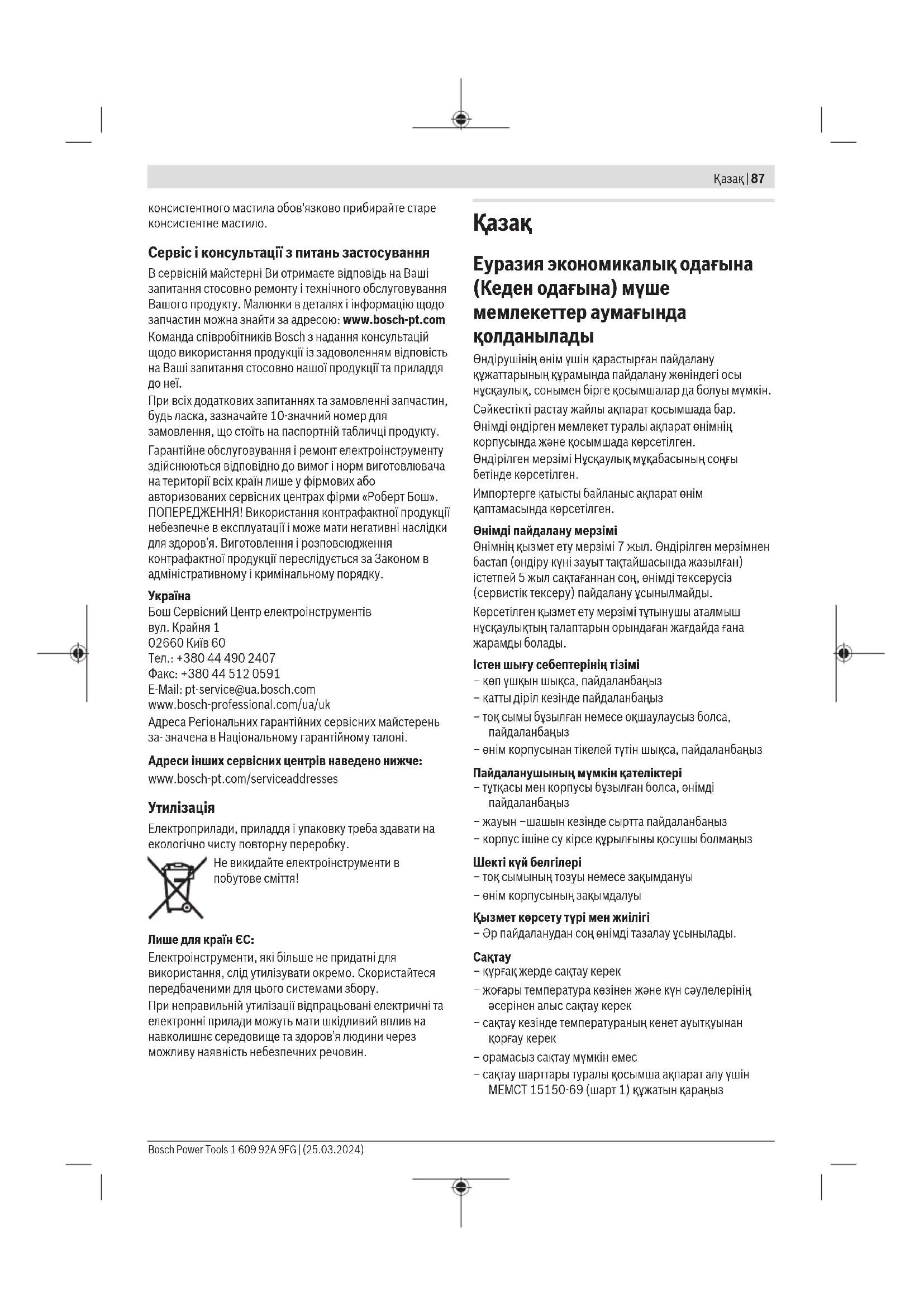Сұрақтар қою және қосалқы бөлшектерге тапсырыс беру кезінде міндетті түрде өнімнің фирмалық тақтайшасындағы 10 таңбалы өнім нөмірін беріңіз. Өндіруші талаптары мен нормаларының сақталуымен электр құралын жөндеу және кепілді қызмет көрсету барлық мемлекеттер аумағында тек “Роберт Бош” фирмалық немесе авторизацияланған қызмет көрсету орталықтарында орындалады. ЕСКЕРТУ! Заңсыз жолмен әкелінген өнімдерді пайдалану қауіпті, денсаулығыңызға зиян келтіруі мүмкін. Өнімдерді заңсыз жасау және тарату әкімшілік және қылмыстық тәртіп бойынша Заңмен қудаланады.