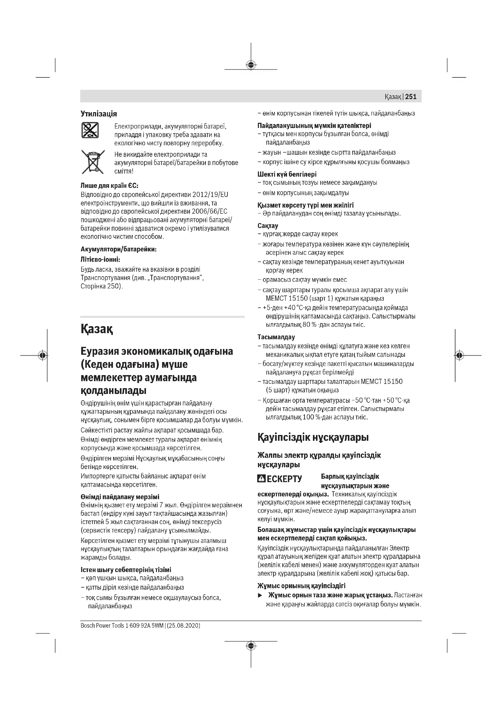 Барлық қауіпсіздік нұсқаулықтарын және ескертпелерді оқыңыз. Техникалық қауіпсіздік нұсқаулықтарын және ескертпелерді сақтамау тоқтың соғуына, өрт және/немесе ауыр жарақаттануларға алып келуі мүмкін. Болашақ жұмыстар үшін қауіпсіздік нұсқаулықтары мен ескертпелерді сақтап қойыңыз. Қауіпсіздік нұсқаулықтарында пайдаланылған Электр құрал атауының желіден қуат алатын электр құралдарына (желілік кабелі менен) және аккумуляторден қуат алатын электр құралдарына (желілік кабелі жоқ) қатысы бар. Жұмыс орнының қауіпсіздігі u Жұмыс орнын таза және жарық ұстаңыз. Ластанған және қараңғы жайларда сәтсіз оқиғалар болуы мүмкін. Bosch Power Tools 1 609 92A 5WM | (25.08.2020)252 | Қазақ u Электр құрылғысын жарылатын атмосферада пайдаланбаңыз, мысалы, жанатын сұйықтық, газ немесе шаң бар болғанда. Электр құрал ұшқындарды жасайды, ал олар шаң немесе буларды жандыруы