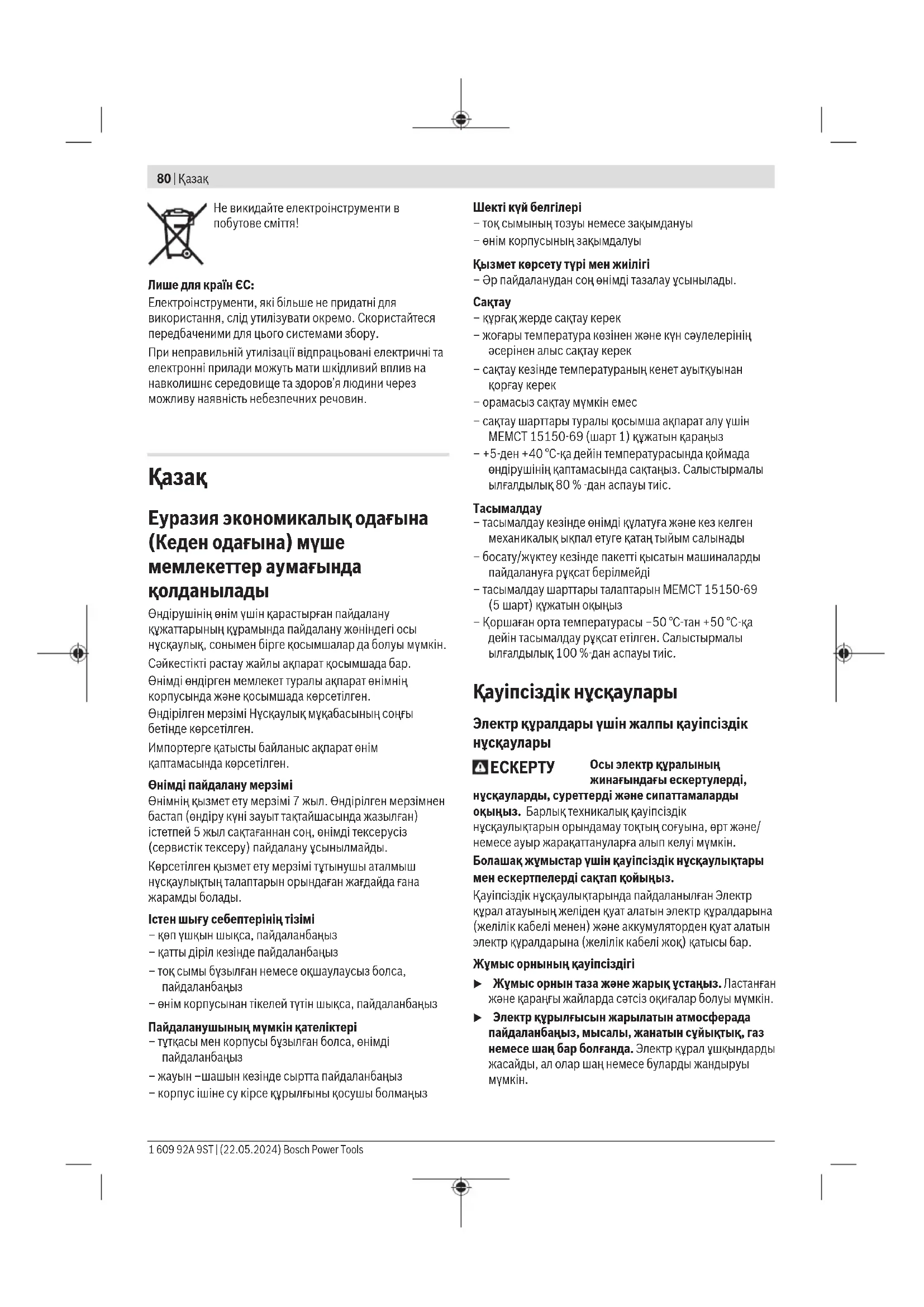 u Кездейсоқ іске қосылудың алдын алу. Тоқ көзіне және/немесе батареялар жинағына қосудан алдын, құралды көтеру немесе тасудан алдын өшіргіш өшік күйде болуына көз жеткізіңіз. Электр құралын саусақты өшіргішке қойып тасу немесе қосқышы қосулы электр құралын тоққа қосу сәтсіз оқиғаға алып келуі мүмкін. u Электр құралын қосудан алдын келген реттеу сынасын немесе кілтті алып қойыңыз. Электр құралының айналатын бөлігінде қалған кілт немесе сына жеке жарақаттануға алып келуі мүмкін. u Көп күш істетпеңіз. Әрдайым тиісті таяныш пен тең салмақытылқты сақтаңыз. Бұл күтілмеген жағдайларда электр құралдың бақылануын сақтайды. u Тиісті киім киіңіз. Бос киім мен әшекейлерді киймеңіз. Шашыңыз бен киімдерді жылжымалы бөлшектерден алыс ұстаңыз. Бос киімдер, әшекейлер немесе ұзын шаш жылжымалы бөлшектер арқылы тартылуы мүмкін. u Егер шаң шығарып жинау жабдықтарына қосу құрылғылары берліген болса, онда олар қосулы болуына және тиісті ретте қолдануына көз жеткізіңіз. Шаң жинауды пайдалану шаңға байланысты зияндарды кемейтеді. u Аспаптарды жиі пайдаланып жақсы білгеннен соң масайрап кетпей қауіпсіздік принциптерін елемей отырмаңыз. Абайсыз әрекет секунд ішінде ауыр жарақаттануға алып келуі мүмкін. u НАЗАР АУДАРЫҢЫЗ! Энергиямен жабдықтаудың толықтай не жекелей тоқтатылуы немесе энергиямен жабдықтауды басқару тізбегінің ақаулануы салдарынан электр құралының жұмысында кідіріс пайда болған жағдайда, бұғатталмағандығына көз жеткізіп (болған жағдайда) барып, ажыратқышты Выкл. (Өшіру) қалпына келтіріңіз. Желілік ашаны розеткадан шығарыңыз немесе алып – салмалы аккумуляторды ажыратыңыз. Осы әрекет арқылы бақыланбайтын қайта іске қосылудың алдын аласыз. u Аталмыш пайдалану жөніндегі нұсқаулыққа сәйкес білікті қызметкерлер құрамына электр құралын реттеу, монтаждау, қолданысқа енгізу және оған қызмет көрсету әрекеттерімен таныс тұлғалар жатады. u Электр құралымен жұмыс істеуге 18 жасқа толған, техникалық сипаттаманы, пайдалану жөніндегі нұсқаулықты және қауіпсіздік ережелерін оқып шыққан тұлғаларға рұқсат етіледі. u Дене, сезім немесе ақыл-ой қабілеттері шектеулі немесе тәжірибесі мен білімі жеткіліксіз адамдар олардың қауіпсіздігі үшін жауапты тұлғаның бақылауында болмаса немесе электр құралын пайдалану бойынша нұсқау алмаған болса, бұйымды пайдаланбауы тиіс. Электр құралдарын пайдалану және күту u Құралды аса көп жүктемеңіз. Жұмысыңыз үшін жарамды электр құралын пайдаланыңыз. Жарамды электр құралымен керекті жұмыс аймағында дұрыс әрі сенімді жұмыс істейсіз. u Ажыратқышы дұрыс емес электр құралын пайдаланбаңыз. Қосуға немесе өшіруге болмайтын Bosch Power Tools 1 609 92A 9ST | (22.05.2024)82 | Қазақ электр құралы қауіпті болып, оны жөндеу қажет