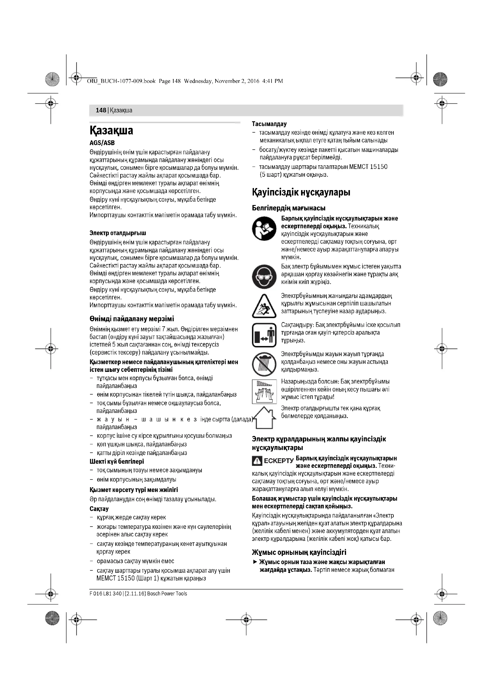 ктері бар құралды пайдаланудан алдын жөндеңіз. Электр құралдарының дұрыс күтілмеуі жазатайым оқиғаларға себеп болып жатады. Кескіш аспаптарды өткір және таза күйде сақтаңыз. Дұрыс күтілген және кескіш жиектері өткір кескіш аспаптар аз кептеліп, кесілетін бетке оңай бағытталады. Электр құралын, жабдықтарды, алмалы-салмалы аспаптарды және т.б. осы нұсқауларға сай пайдаланыңыз. Сонымен жұмыс шарттарымен OBJ_BUCH-1077-009.book Page 149 Wednesday, November 2, 2016 4:41 PM150 | Қазақша F 016 L81 340 | (2.11.16) Bosch Power Tools орындайтын әрекеттерге назар аударыңыз. Электр құралдарын арналмаған жұмыстарда пайдалану