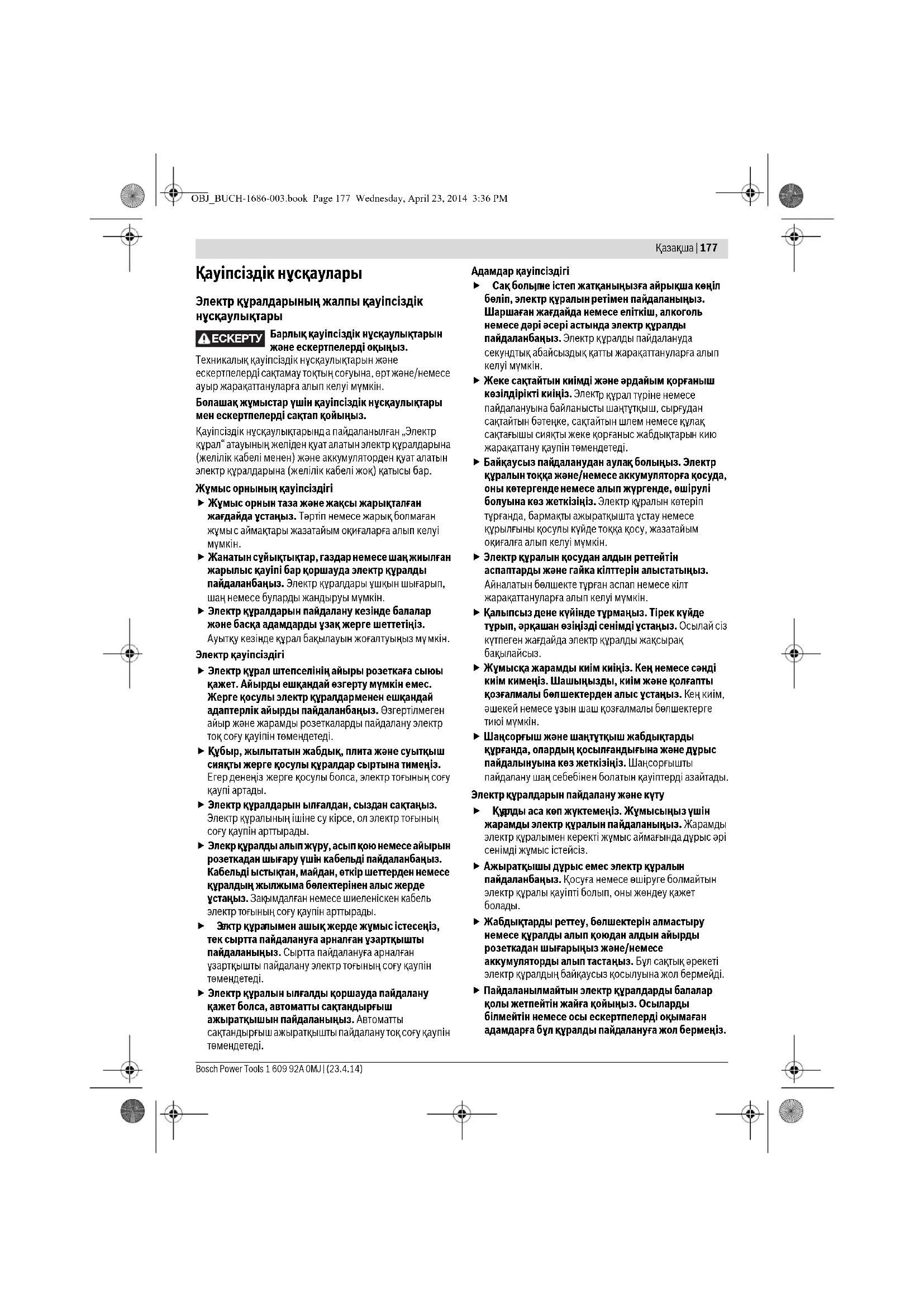 асымалдау шарттары талаптарын МЕМСТ 15150 (5 шарт) құжатын оқыңыз. OBJ_BUCH-1686-003.book Page 176 Wednesday, April 23, 2014 3:36 PMҚaзақша | 177 Bosch Power Tools 1 609 92A 0MJ | (23.4.14) Қауіпсіздік нұсқаулары Электр құралдарының жалпы қауіпсіздік нұсқаулықтары Барлық қауіпсіздік нұсқаулықтарын және ескертпелерді оқыңыз. Техникалық қауіпсіздік нұсқаулықтарын және ескертпелерді сақтамау тоқтың соғуына, өрт және/немесе ауыр жарақаттануларға алып келуі мүмкін. Болашақ жұмыстар үшін қауіпсіздік нұсқаулықтары мен ескертпелерді сақтап қойыңыз. Қауіпсіздік нұсқаулықт