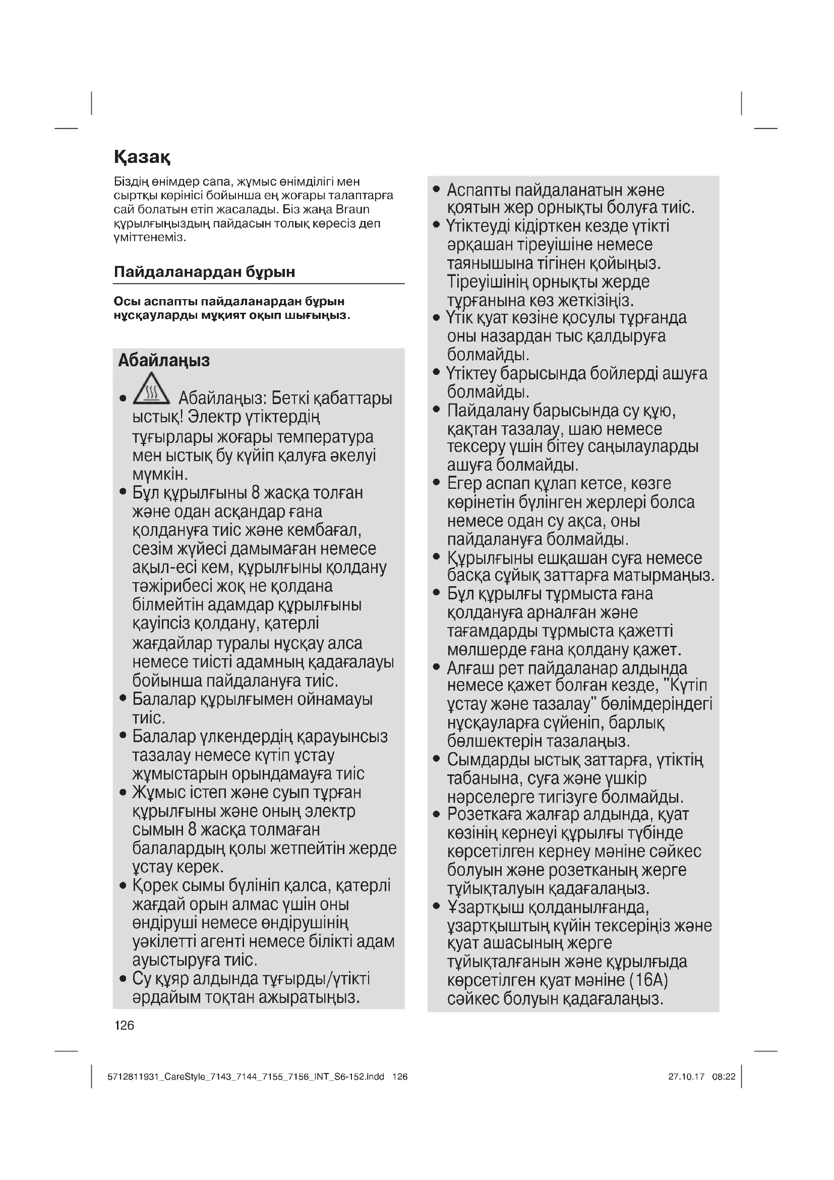 БіздіÃ Êнімдер сапа, ж×мыс Êнімділігі мен сыртÞы кÊрінісі бойынша еà жоары талаптара сай болатын етіп жасалады. Біз жаÃа Braun Þ×рылыÃыздыà пайдасын толыÞ кÊресіз деп міттенеміз. Пайдаланардан б§рын Осы аспапты пайдаланардан б§рын н§сауларды м§ият оып шы³ы´ыз.