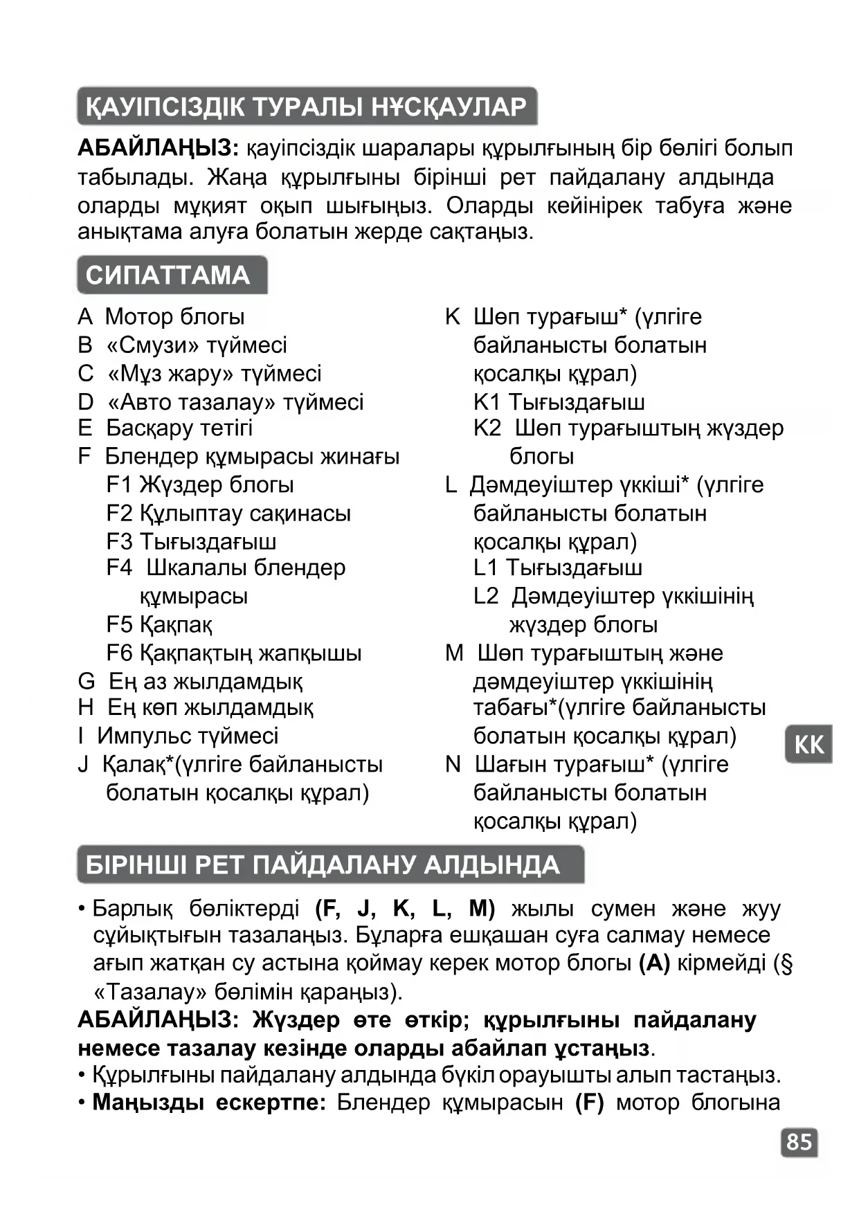 L Дәмдеуіштер үккіші* (үлгіге байланысты болатын қосалқы құрал) L1 Тығыздағыш L2 Дәмдеуіштер үккішінің жүздер блогы M Шөп турағыштың және дәмдеуіштер үккішінің табағы*(үлгіге байланысты болатын қосалқы құрал) N Шағын турағыш* (үлгіге байланысты болатын қосалқы құрал) АБАЙЛАҢЫЗ: қауіпсіздік шаралары құрылғының бір бөлігі болып табылады. Жаңа құрылғыны бірінші рет пайдалану алдында оларды мұқият оқып шығыңыз. Оларды кейінірек табуға және анықтама алуға болатын жерде сақтаңыз.