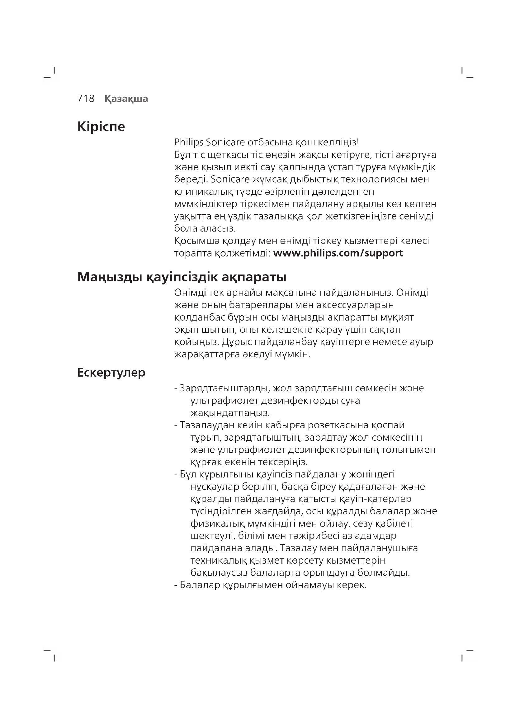 Philips Sonicare отбасына қош келдіңіз! Бұл тіс щеткасы тіс өңезін жақсы кетіруге, тісті ағартуға және қызыл иекті сау қалпында ұстап тұруға мүмкіндік береді. Sonicare жұмсақ дыбыстық технологиясы мен клиникалық түрде әзірленіп дәлелденген мүмкіндіктер тіркесімен пайдалану арқылы кез келген уақытта ең үздік тазалыққа қол жеткізгеніңізге сенімді бола аласыз. Қосымша қолдау мен өнімді тіркеу қызметтері келесі торапта қолжетімді: www.philips.com/support Маңызды қауіпсіздік ақпараты Өнімді тек арнайы мақсатына пайдаланыңыз. Өнімді және оның батареялары мен аксессуарларын қолданбас бұрын осы маңызды ақпаратты мұқият оқып шығып, оны келешекте қарау үшін сақтап қойыңыз. Дұрыс пайдаланбау қауіптерге немесе ауыр жарақаттарға әкелуі мүмкін.