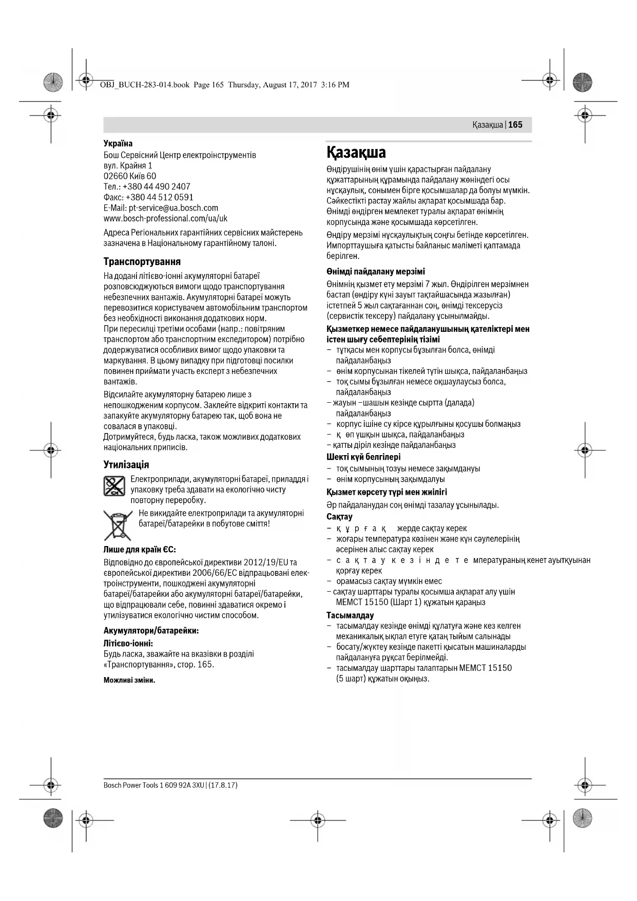 Електроприлади, акумуляторні батареї, приладдя і упаковку треба здавати на екологічно чисту повторну переробку. Не викидайте електроприлади та акумуляторні батареї/батарейки в побутове сміття! Лише для країн ЄС: Відповідно до європейської директиви 2012/19/EU та європейської директиви 2006/66/EC відпрацьовані елек- троінструменти, пошкоджені акумуляторні батареї/батарейки або акумуляторні батареї/батарейки, що відпрацювали себе, повинні здаватися окремо і утилізуватися екологічно чистим способом. Акумулятори/батарейки: Літієво-іонні: Будь ласка, зважайте на вказівки в розділі «Транспортування», стор. 165. Можливі зміни. Қaзақша Өндірушінің өнім үшін қарастырған пайдалану құжаттарының құрамында пайдалану жөніндегі осы нұсқаулық, сонымен бірге қосымшалар да болуы мүмкін. Сәйкестікті растау жайлы ақпарат қосымшада бар. Өнімді өндірген мемлекет туралы ақпарат өнімнің корпусында және қосымшада көрсетілген. Өндіру мерзімі нұсқаулықтың соңғы бетінде көрсетілген. Импорттаушыға қатысты байланыс мәліметі қаптамада