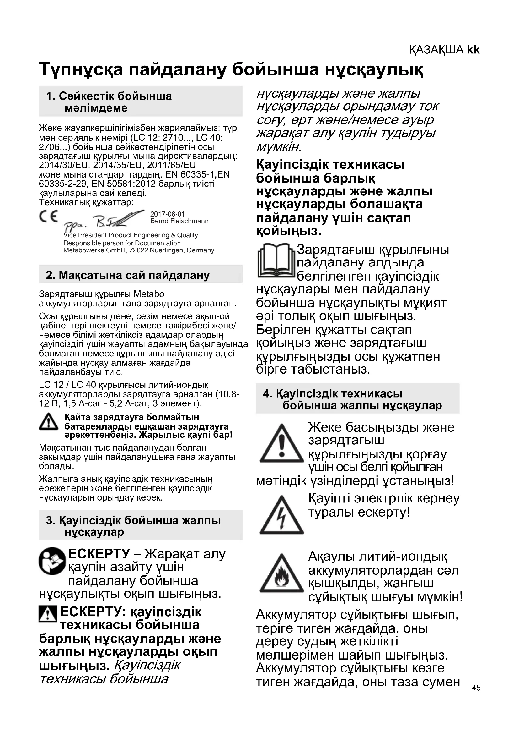 LC 12 - Батарея зарядтағышы METABO - Тегін пайдаланушы нұсқаулығы