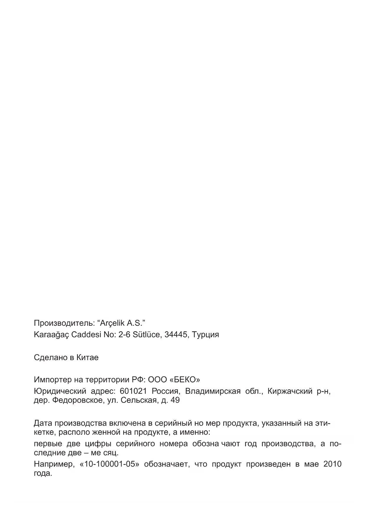 служивание изделия в случаях:Производитель: “Arçelik A.S.” Karaağaç Caddesi No: 2-6 Sütlüce, 34445, Турция Сделано в Китае Импортер на территории РФ: ООО «БЕКО» Юридический адрес: 601021 Россия, Владимирская обл., Киржачский р-н, дер. Федоровское, ул. Сельская, д. 49 Дата производства включена в серийный но мер продукта, указанный на эти- кетке, располо женной на продукте, а именно: первые две цифры серийного номера обозна чают год производства, а по- следние две – ме сяц. Например, «10-100001-05» обозначает, что продукт произведен в мае 2010 года.Алдымен осы пайдаланушы нұсқаулығын оқып шығыңыз! Құрметті тұтынушы, Осы Beko құрылғысын жөн көргеніңізге рахмет. Жоғары сапалы және заманауи технология арқылы өндірілген құрылғыңыздан ең жақсы нәтижелер аласыз деп үміттенеміз. Осы себепті, құрылғыны пайдалану алдында осы толық пайдаланушы нұсқаулығын және барлық басқа ілеспе құжаттарды мұқият оқып шығыңыз және болашақта пайдаланатын анықтама ретінде сақтаңыз. Құрылғыны басқа біреуге берсеңіз, пайдаланушы нұсқаулығын да беріңіз. Нұсқауларды орындаңыз, пайдаланушы нұсқаулығындағы бүкіл ақпарат пен ескертулерге көңіл бөліңіз. Сондай-ақ бұл пайдаланушы нұсқаулығы басқа үлгілерге қатысты болуы мүмкін екенін есте сақтаңыз. Үлгілер арасындағы айырмашылықтар нұсқаулықта ашық түрде сипатталған. Таңбалардың мағыналары Осы пайдаланушы нұсқаулығының әртүрлі бөлімдерінде келесі таңбалар пайдаланылады: