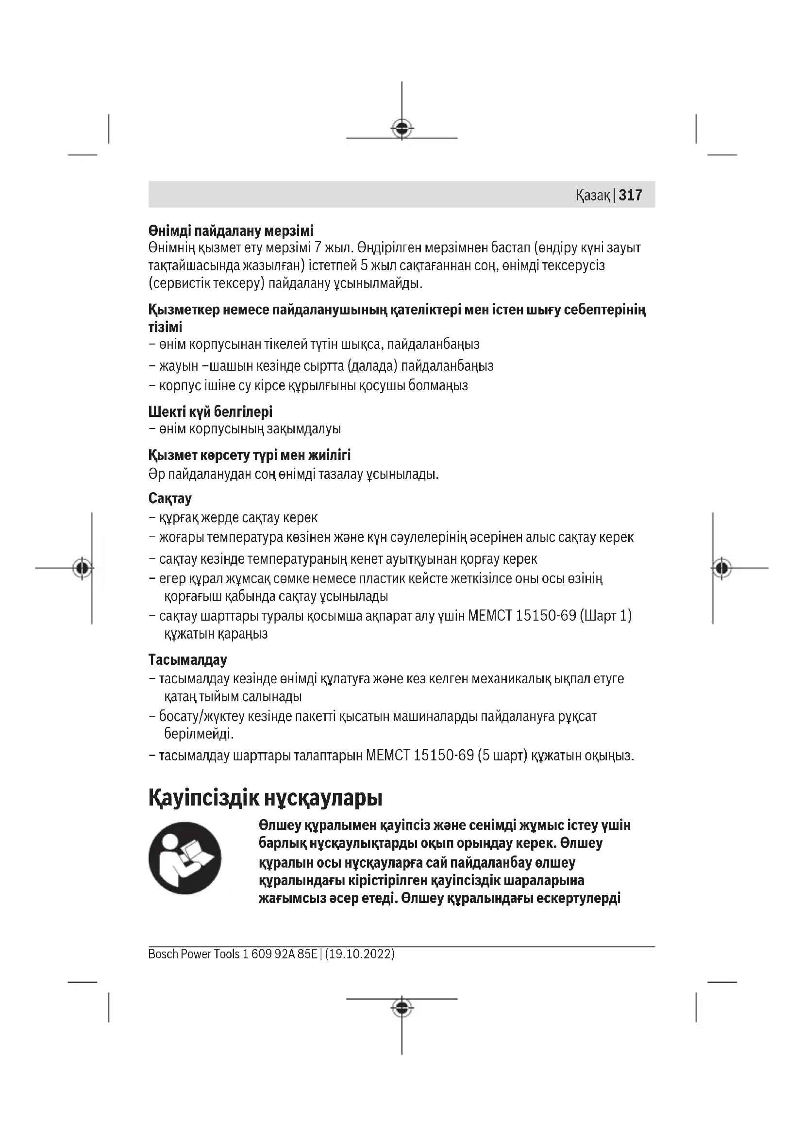 Еуразия экономикалық одағына (Кеден одағына) мүше мемлекеттер аумағында қолданылады Өндірушінің өнім үшін қарастырған пайдалану құжаттарының құрамында пайдалану жөніндегі осы нұсқаулық, сонымен бірге қосымшалар да болуы мүмкін. Сəйкестікті растау жайлы ақпарат қосымшада бар. Өнімді өндірген мемлекет туралы ақпарат өнімнің корпусында жəне қосымшада көрсетілген. Өндірілген мерзімі Нұсқаулық мұқабасының соңғы бетінде және өнім корпусында көрсетілген. Импортерге қатысты байланыс ақпарат өнім қаптамасында көрсетілген. 1 609 92A 85E | (19.10.2022) Bosch Power ToolsҚазақ | 317 Өнімді пайдалану мерзімі Өнімнің қызмет ету мерзімі 7 жыл. Өндірілген мерзімнен бастап (өндіру күні зауыт тақтайшасында жазылған) істетпей 5 жыл сақтағаннан соң, өнімді тексерусіз (сервистік тексеру) пайдалану ұсынылмайды. Қызметкер немесе пайдаланушының қателіктері мен істен шығу себептерінің