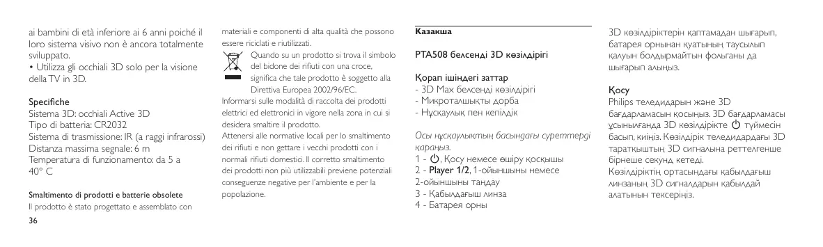 Player 1/2. • Si le voyant s’allume en orange de manière continue pendant 2 secondes, les lunettes sont réglées pour le joueur 1. • Si le voyant clignote en orange, les lunettes sont réglées pour le joueur 2. Sur le téléviseur, dans Aide, recherchez Jeu à deux pour de plus amples informations. Remplacement de la pile Voir les illustrations au début du manuel. Pour remplacer la pile des lunettes 3D PTA508, dévissez le petit couvercle du com-