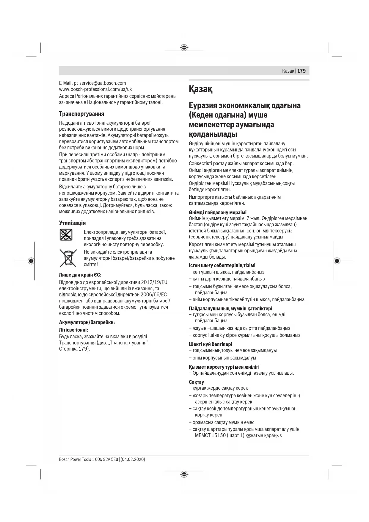 Bosch Power Tools 1 609 92A 5E8 | (04.02.2020)184 | Қазақ u Аккумулятор зақымдалған немесе дұрыс пайдаланылмаған жағдайда, одан бу шығуы мүмкін. Аккумулятор жанып немесе жарылып қалуы мүмкін. Таза ауа ішке тартыңыз және шағымдар болса, дәрігердің көмегіне жүгініңіз. Бу тыныс алу жолдарын тітіркендіруі мүмкін. u Аккумуляторды ашпаңыз. Қысқа тұйықталу қауіпі u Шеге немесе бұрауыш сияқты ұшты заттар немесе сыртқы әсер арқылы аккумулулятор зақымдануы мүмкін. Бұл қысқа тұйықталуға алып келіп, аккумулятор жануы, түтін шығаруы, жарылуы немесе қызып кетуі мүмкін. u Бұл аккумуляторды тек қана осы өндіруші өнімдерінде пайдаланыңыз. Сол арқылы аккумуляторды қауіпті, артық жүктеуден сақтайсыз. Аккумуляторды, жылудан, сондай-ақ, мысалы, үздіксіз күн жарығынан, оттан, кірден, судан және ылғалдан қорғаңыз. Жарылыс және қысқа тұйықталу қаупі