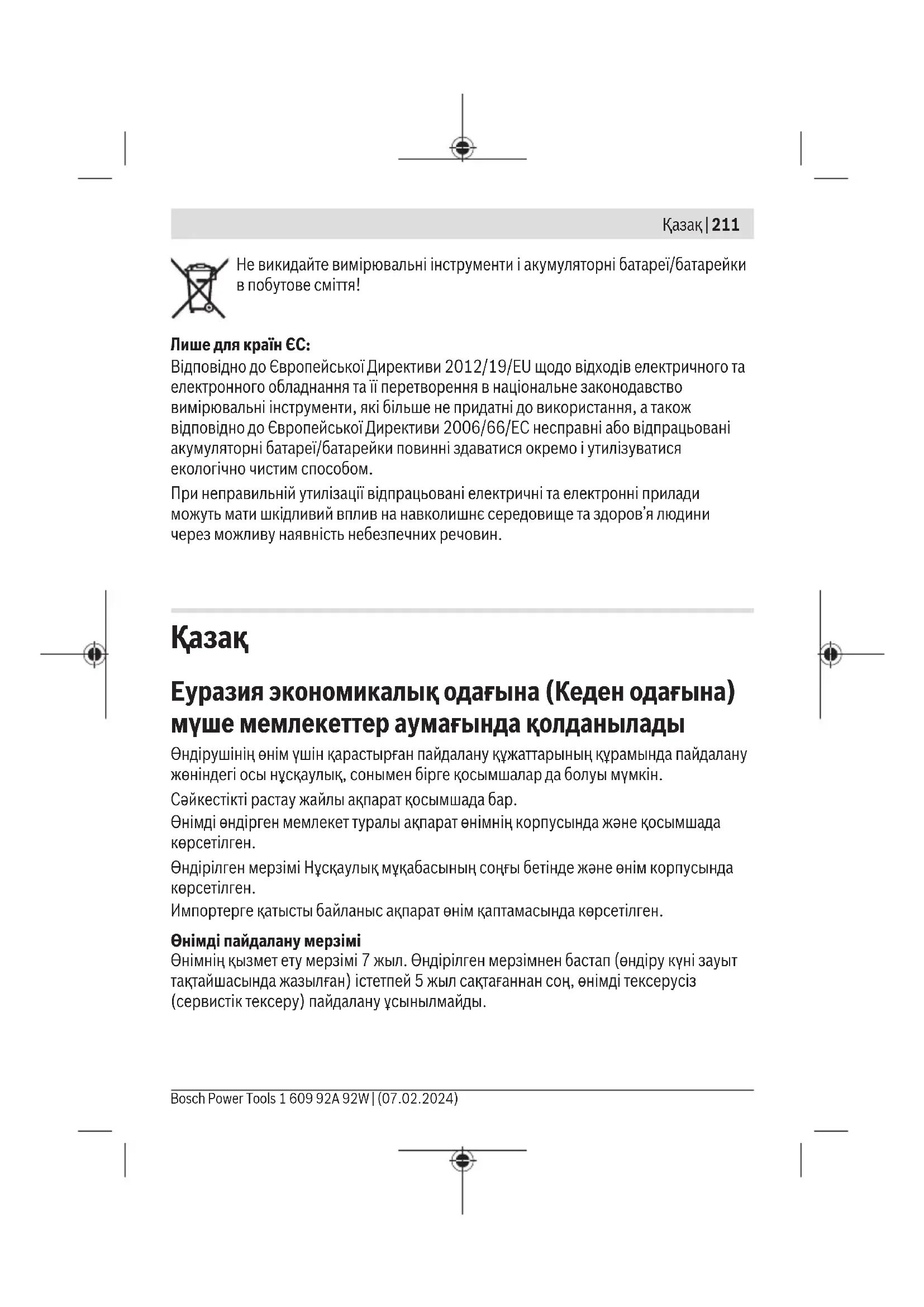 Еуразия экономикалық одағына (Кеден одағына) мүше мемлекеттер аумағында қолданылады Өндірушінің өнім үшін қарастырған пайдалану құжаттарының құрамында пайдалану жөніндегі осы нұсқаулық, сонымен бірге қосымшалар да болуы мүмкін. Сəйкестікті растау жайлы ақпарат қосымшада бар. Өнімді өндірген мемлекет туралы ақпарат өнімнің корпусында жəне қосымшада көрсетілген. Өндірілген мерзімі Нұсқаулық мұқабасының соңғы бетінде және өнім корпусында көрсетілген. Импортерге қатысты байланыс ақпарат өнім қаптамасында көрсетілген. Өнімді пайдалану мерзімі Өнімнің қызмет ету мерзімі 7 жыл. Өндірілген мерзімнен бастап (өндіру күні зауыт тақтайшасында жазылған) істетпей 5 жыл сақтағаннан соң, өнімді тексерусіз (сервистік тексеру) пайдалану ұсынылмайды. Bosch Power Tools 1 609 92A 92W | (07.02.2024)212 | Қазақ Қызметкер немесе пайдаланушының қателіктері мен істен шығу себептерінің