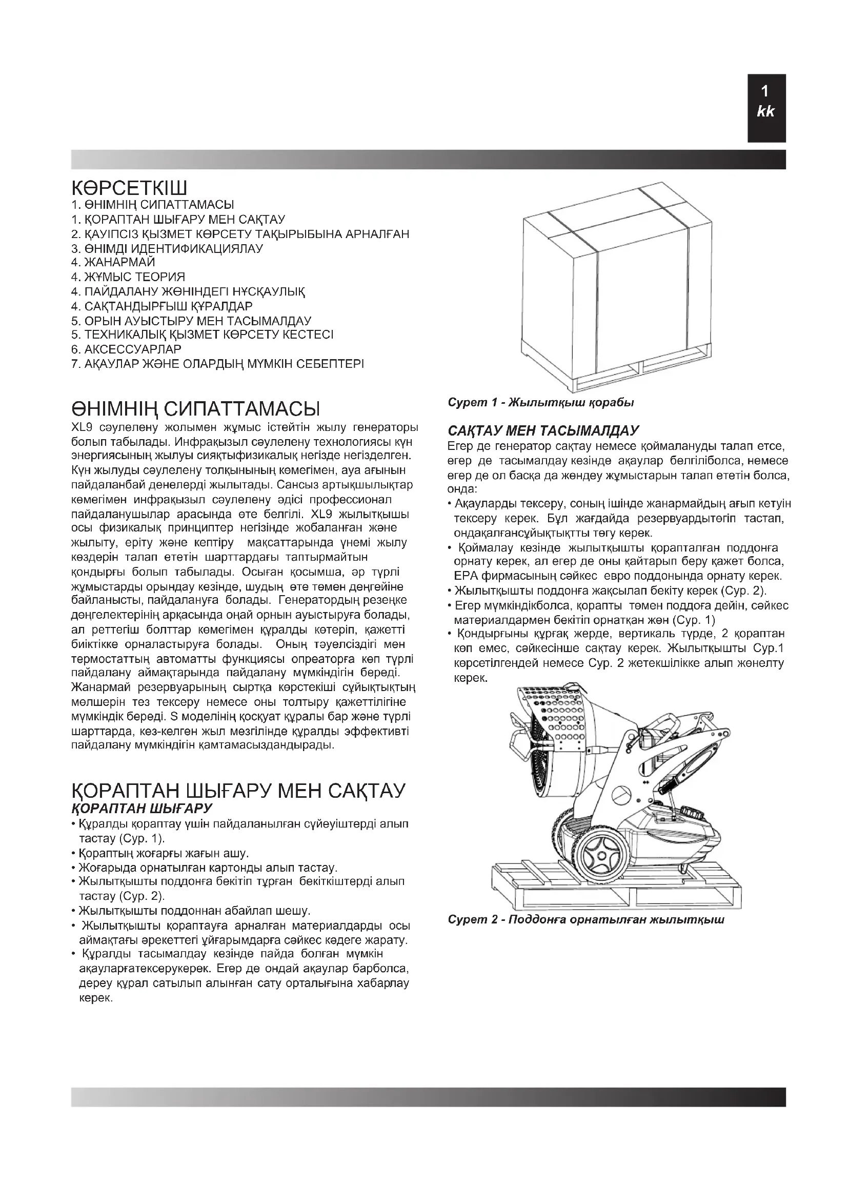 ӨНІМНІҢ СИПАТТАМАСЫ XL9 сәулелену жолымен жұмыс істейтін жылу генераторы болып табылады. Инфрақызыл сәулелену технологиясы күн энергиясының жылуы сияқтыфизикалық негізде негізделген. Күн жылуды сәулелену толқынының көмегімен, ауа ағынын пайдаланбай денелерді жылытады. Сансыз артықшылықтар көмегімен инфрақызыл сәулелену әдісі профессионал пайдаланушылар арасында өте белгілі. XL9 жылытқышы осы физикалық принциптер негізінде жобаланған және жылыту, еріту және кептіру мақсаттарында үнемі жылу көздерін талап ететін шарттардағы таптырмайтын қондырғы болып табылады. Осыған қосымша, әр түрлі жұмыстарды орындау кезінде, шудың өте төмен деңгейіне байланысты, пайдалануға болады. Генератордың резеңке дөңгелектерінің арқасында оңай орнын ауыстыруға болады, ал реттегіш болттар көмегімен құралды көтеріп, қажетті биіктікке орналастыруға болады. Оның тәуелсіздігі мен термостаттың автоматты функциясы опреаторға көп түрлі пайдалану аймақтарында пайдалану мүмкіндігін береді. Жанармай резервуарының сыртқа көрстекіші сұйықтықтың мөлшерін тез тексеру немесе оны толтыру қажеттілігіне мүмкіндік береді. S моделінің қосқуат құралы бар және түрлі шарттарда, кез-келген жыл мезгілінде құралды эффективті пайдалану мүмкіндігін қамтамасыздандырады. ҚОРАПТАН ШЫҒАРУ МЕН САҚТАУ ҚОРАПТАН ШЫҒАРУ