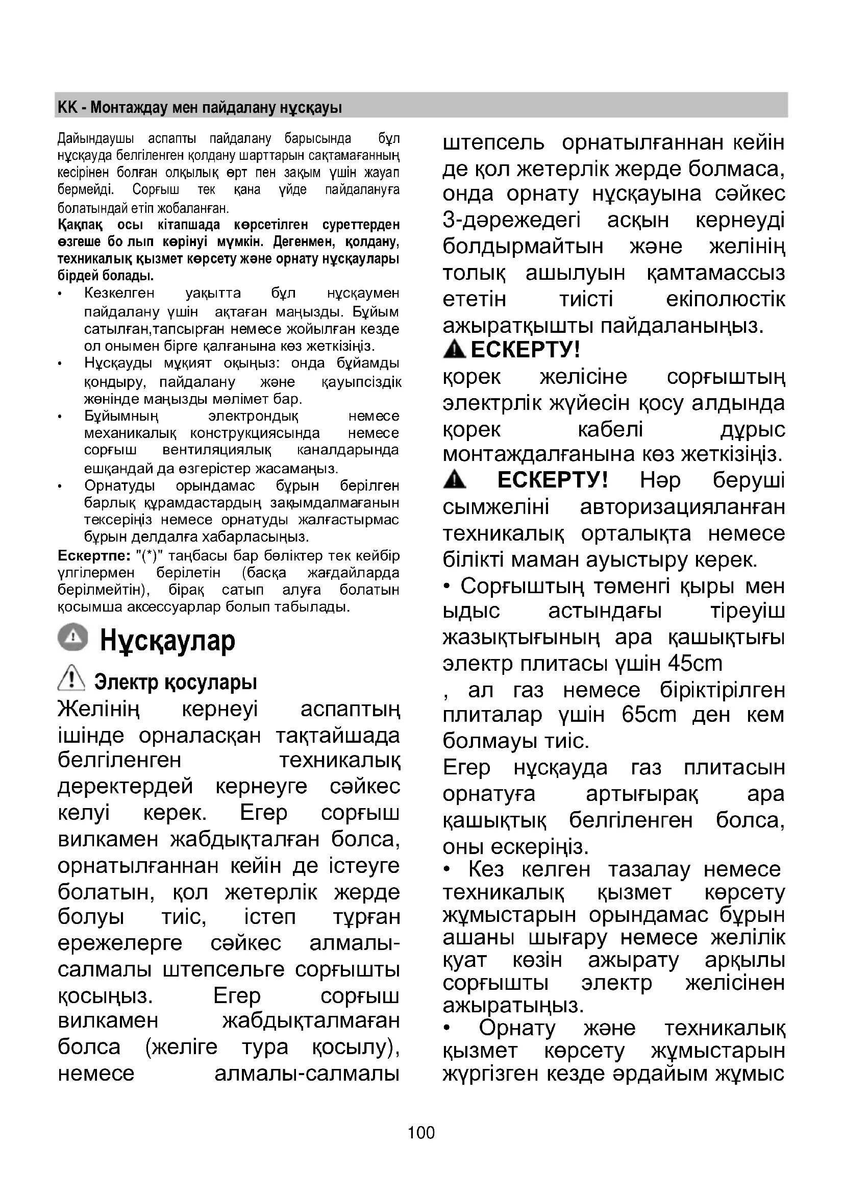 - Сорғыштың төменгі қыры мен ыдыс астындағы тіреуіш жазықтығының ара қашықтығы электр плитасы үшін 45cm , ал газ немесе біріктірілген плиталар үшін 65cm ден кем болмауы тиіс. Егер нұсқауда газ плитасын орнатуға артығырақ ара қашықтық белгіленген болса, оны ескеріңіз.