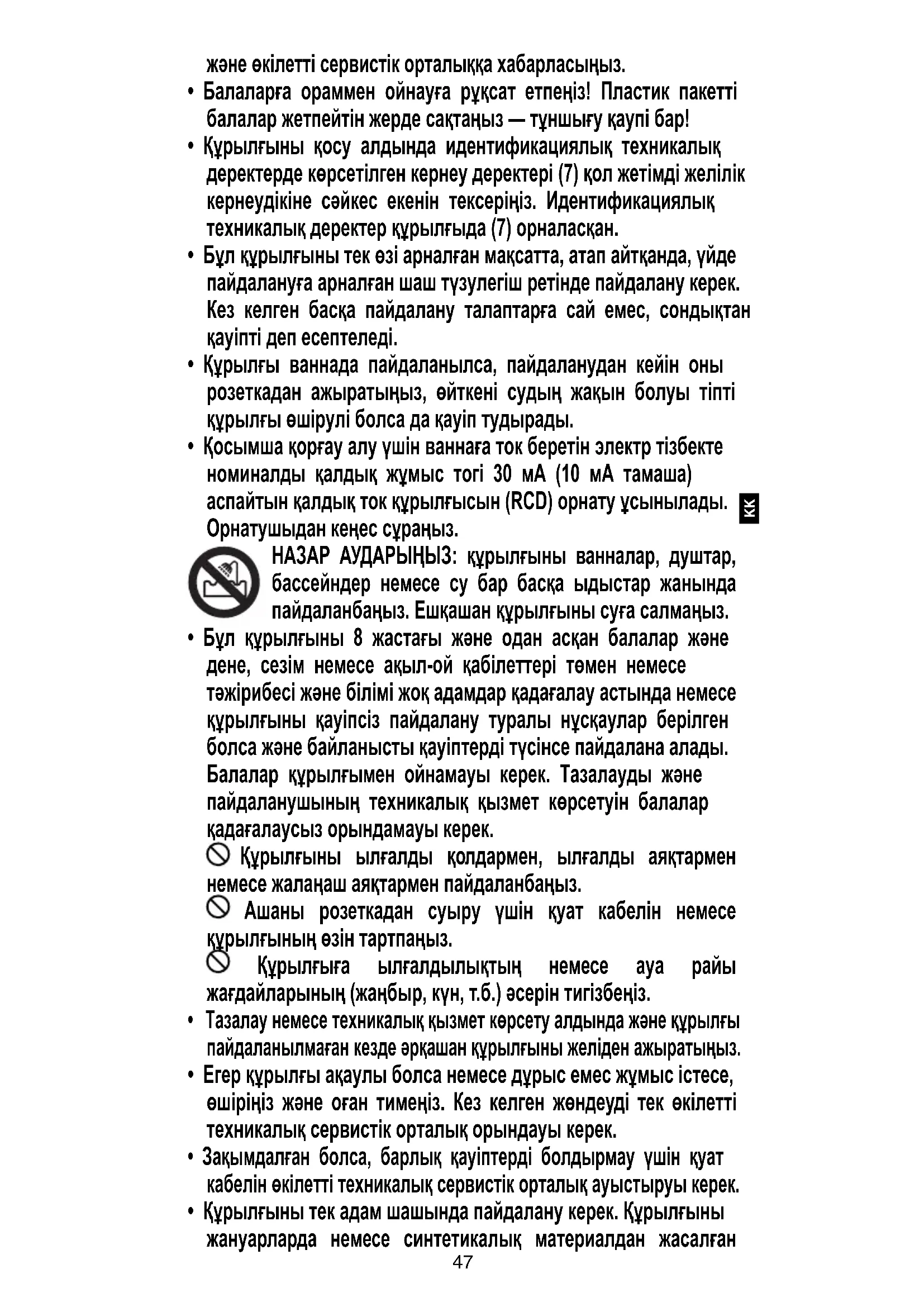 - Қосымша қорғау алу үшін ваннаға ток беретін электр тізбекте номиналды қалдық жұмыс тогі 30 мА (10 мА тамаша) аспайтын қалдық ток құрылғысын (RCD) орнату ұсынылады. Орнатушыдан кеңес сұраңыз. НАЗАР АУДАРЫҢЫЗ: құрылғыны ванналар, душтар, бассейндер немесе су бар басқа ыдыстар жанында пайдаланбаңыз. Ешқашан құрылғыны суға салмаңыз.