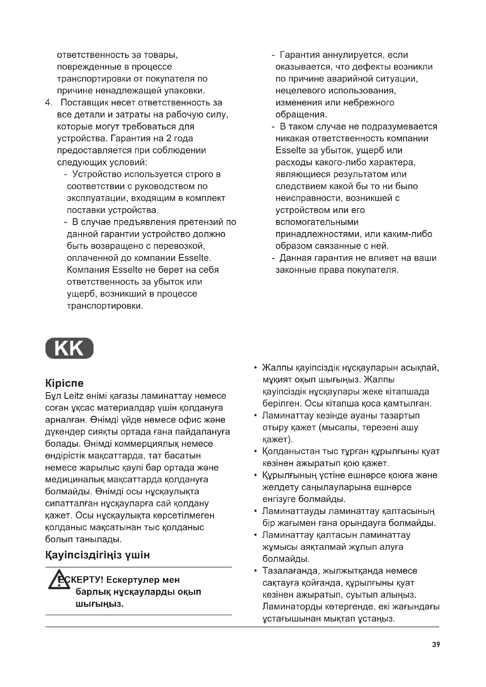 қажетті жұмыс шығындарына жабдықтаушы жауапты болады. 2 жылдық кепілдік шарттары: - Құрылғы жабдықталған қолдану нұсқауларға сай қолданылуы тиіс. - Егер кепілдікті қолдану қажет болса, құрылғыны Esselte компаниясына қайтарып, жеткізу шығынын көтеру қажет болады. Esselte жеткізу кезінде орын алған жоғалу немес бұзылу жағдайларына жауапты емес. - Ақаулар қандай да апат, дұрыс қолданбау, өзгерту немесе немқұрайдылық себебінен болғаны анықталса, кепілдік қолданылмайды. - Esselte компаниясы құрылғының және оның жабдықтарының ақаулықтары салдарынан болған бұзылу немесе жоғалу жағдайларына жауапты емес. - Бұл кепілдік сіздің заңдық құқықтарыңызға әсер етпейді.
