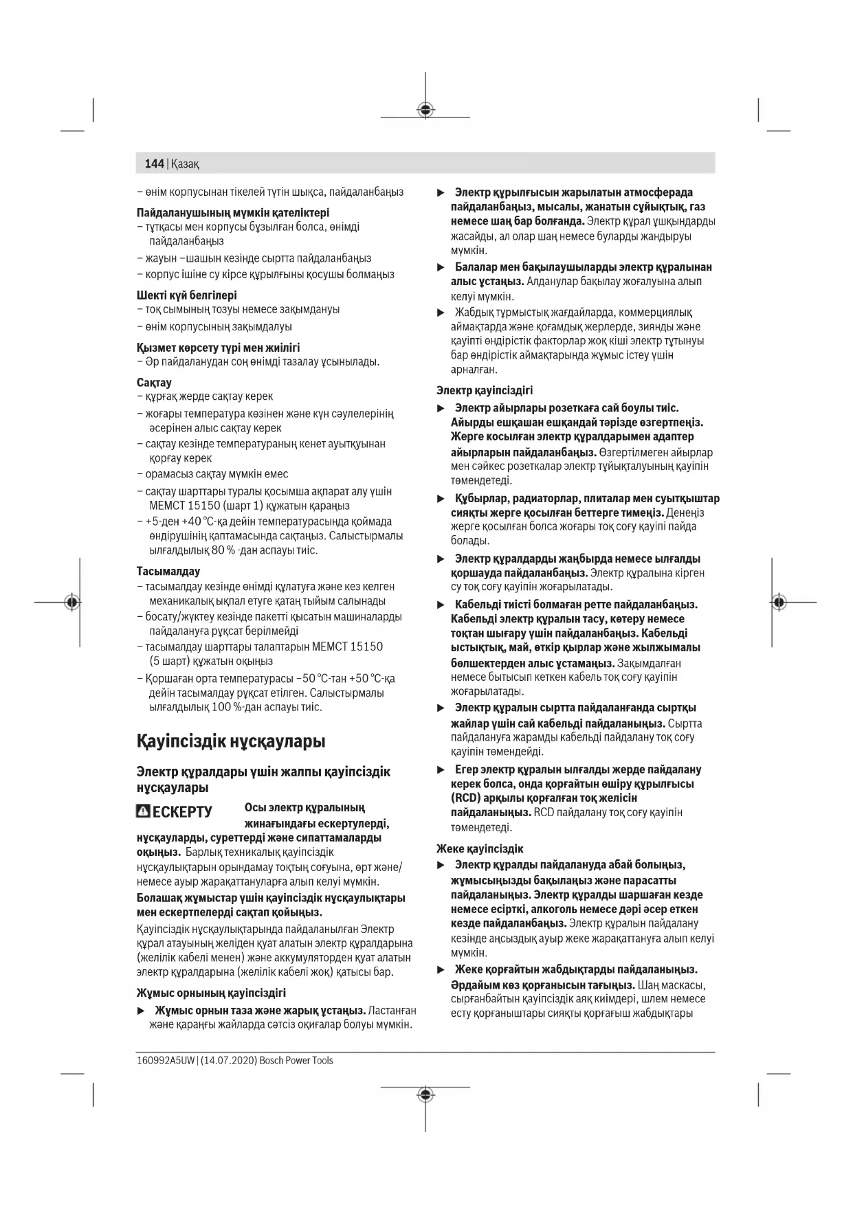 Еуразия экономикалық одағына (Кеден одағына) мүше мемлекеттер аумағында қолданылады Өндірушінің өнім үшін қарастырған пайдалану құжаттарының құрамында пайдалану жөніндегі осы нұсқаулық, сонымен бірге қосымшалар да болуы мүмкін. Сəйкестікті растау жайлы ақпарат қосымшада бар. Өнімді өндірген мемлекет туралы ақпарат өнімнің корпусында жəне қосымшада көрсетілген. Өндірілген мерзімі Нұсқаулық мұқабасының соңғы бетінде көрсетілген. Импортерге қатысты байланыс ақпарат өнім қаптамасында көрсетілген. Өнімді пайдалану мерзімі Өнімнің қызмет ету мерзімі 7жыл. Өндірілген мерзімнен бастап (өндіру күні зауыт тақтайшасында жазылған) істетпей 5жыл сақтағаннан соң, өнімді тексерусіз (сервистік тексеру) пайдалану ұсынылмайды. Көрсетілген қызмет ету мерзімі тұтынушы аталмыш нұсқаулықтың талаптарын орындаған жағдайда ғана жарамды болады. Iстен шығу себептерінің тізімі – қөп үшқын шықса, пайдаланбаңыз – қатты діріл кезінде пайдаланбаңыз – тоқ сымы бұзылған немесе оқшаулаусыз болса, пайдаланбаңыз Bosch Power Tools 160992A5UW | (14.07.2020)144 | Қазақ – өнім корпусынан тікелей түтін шықса, пайдаланбаңыз Пайдаланушының мүмкін қателіктері – тұтқасы мен корпусы бұзылған болса, өнімді пайдаланбаңыз – жауын –шашын кезінде сыртта пайдаланбаңыз – корпус ішіне су кірсе құрылғыны қосушы болмаңыз Шекті күй белгілері – тоқ сымының тозуы немесе зақымдануы – өнім корпусының зақымдалуы Қызмет көрсету түрі мен жиілігі – Әр пайдаланудан соң өнімді тазалау ұсынылады.