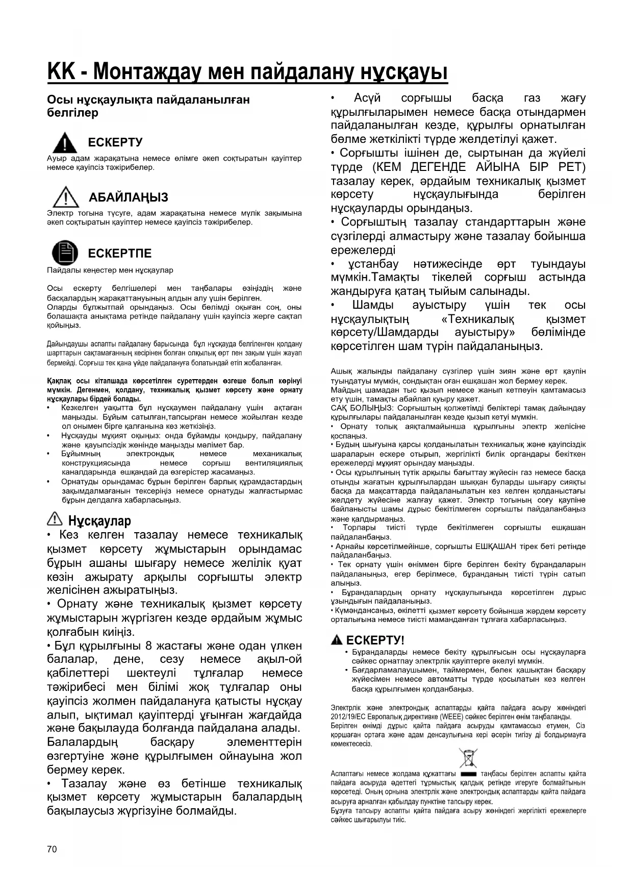 - Бағдарламалаушымен, таймермен, бөлек қашықтан басқару жүйесімен немесе автоматты түрде қосылатын кез келген басқа құрылғымен қолданбаңыз. Электрлік жəне электрондық аспаптарды қайта пайдаға асыру жөніндегі 2012/19/EC Европалық директивке (WEEE) сəйкес берілген өнім таңбаланды.